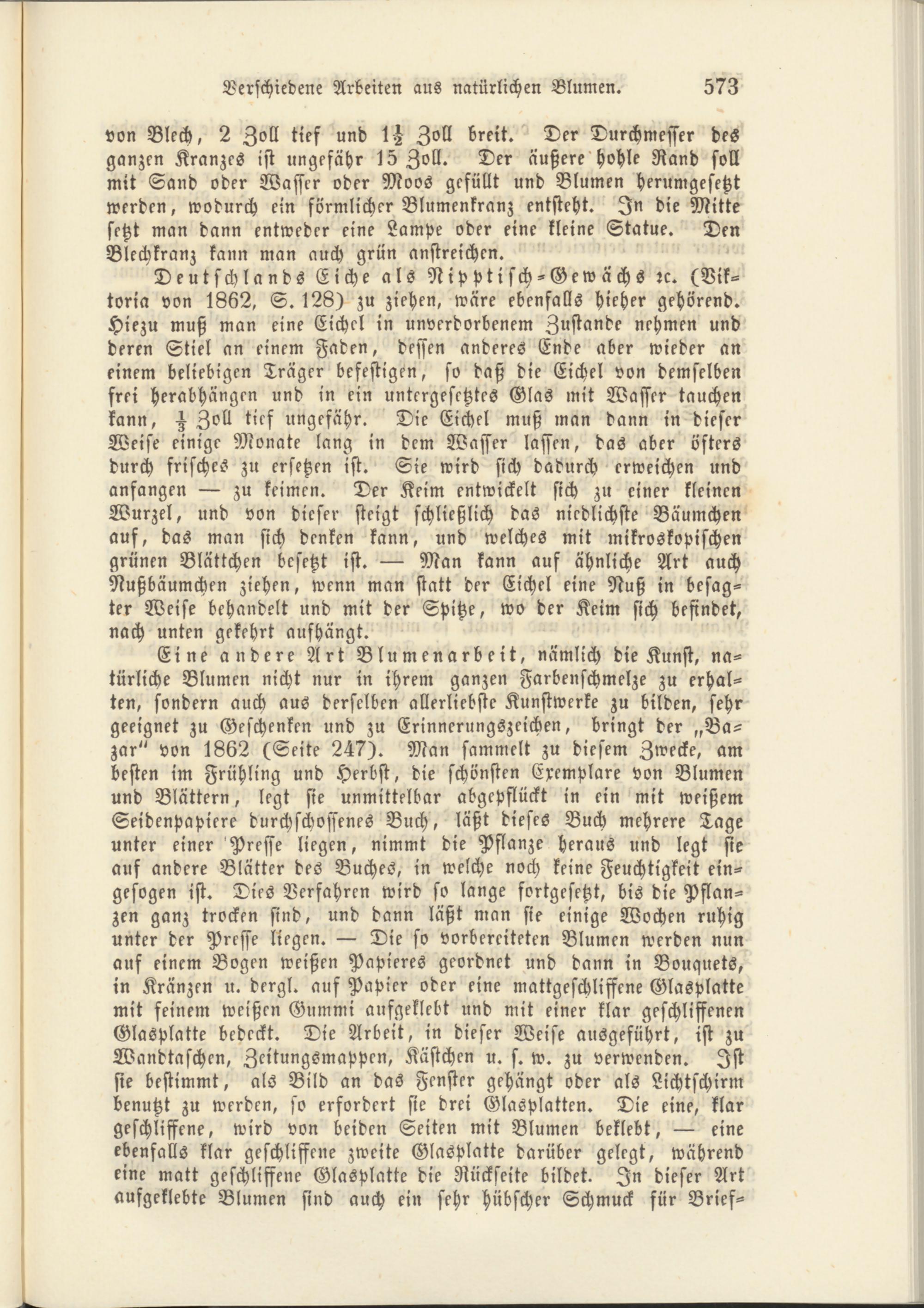 Eine andere Art Blumenarbeit, nämlich die Kunst, natürliche Blumen nicht nur in ihrem ganzen Farbenschmelze zu erhalten, sondern auch aus derselben allerliebste Kunstwerke zu bilden, sehr geeignet zu Geschenken und zu Erinnerungszeichen, bringt der „Ba- zar" von 1862 (Seite 247). Man sammelt zu diesem Zwecke, am besten im Frühling und Herbst, die schönsten Exemplare von Blumen und Blättern, legt sie unmittelbar abgepflückt in ein mit weißem Seidenpapiere durchschossenes Buch, läßt dieses Buch mehrere Tage unter einer Presse liegen, nimmt die Pflanze heraus und legt sie auf andere Blätter des Buches, in welche noch keine Feuchtigkeit ein- gesogen ist. Dies Verfahren wird so lange fortgesetzt, bis die Pflanzen ganz trocken sind, und dann läßt man sie einige Wochen ruhig unter der Presse liegen. — Die so vorbereiteten Blumen werden nun auf einem Bogen weißen Papieres geordnet und dann in Bouquets, in Kränzen n. dergl. auf Papier oder eine mattgeschliffene Glasplatte mit feinem weißen Gummi aufgeklebt und mit einer klar geschliffenen Glasplatte bedeckt. Die Arbeit, in dieser Weise ausgeführt, ist zu Wandtaschen, Zeitungsmappen, Kästchen u. s. w. zu verwenden. Ist sie bestimmt, als Bild an das Fenster gehängt oder als Lichtschirm benutzt zu werden, so erfordert sie drei Glasplatten. Die eine, klar geschliffene, wird von beiden Seiten mit Blumen beklebt, — eine ebenfalls klar geschliffene zweite Glasplatte darüber gelegt, während eine matt geschliffene Glasplatte die Rückseite bildet. In dieser Art aufgeklebte Blumen sind auch ein sehr hübscher Schmuck für Brief-