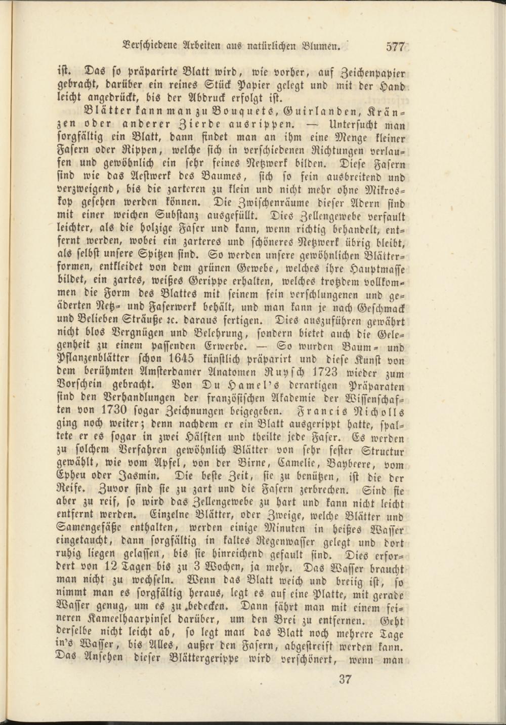 Blätter kann man zu Bouquets, Guirlanden, Kränzen oder anderer Zierde ausrippen. — Untersucht man sorgfältig ein Blatt, dann findet man an ihm eine Menge kleiner Fasern oder Rippen, welche sich in verschiedenen Richtungen verlaufen und gewöhnlich ein sehr feines Netzwerk bilden. Diese Fasern sind wie das Aestwerk des Baumes, sich so fein ausbreitend und verzweigend, bis die zarteren zu klein und nicht mehr ohne Mikroskop gesehen werden können. Die Zwischenräume dieser Adern sind mit einer weichen Substanz ausgefüllt. Dies Zellcngewebe verfault leichter, als die holzige Faser und kann, wenn richtig behandelt, entfernt werden, wobei ein zarteres und schöneres Netzwerk übrig bleibt, als selbst unsere Spitzen sind. So werden unsere gewöhnlichen Blätterformen, entkleidet von dem grünen Gewebe, welches ihre Hauptmasse bildet, ein zartes, weißes Gerippe erhalten, welches trotzdem vollkommen die Form des Blattes mit seinem fein verschlungenen und geäderten Netz- und Faserwerk behält, und man kann je nach Geschmack und Belieben Sträuße rc. daraus fertigen. Dies auszuführen gewährt nicht blos Vergnügen und Belehrung, sondern bietet auch die Gelegenheit zu einem passenden Erwerbe. — So wurden Baum- und Pflanzenblätter schon 1645 künstlich präparirt und diese Kunst von dem berühmten Amsterdamer Anatomen Ruysch 1723 wieder zum Vorschein gebracht. Von Du Hamel's derartigen Präparaten sind den Verhandlungen der französischen Akademie der Wissenschaften von 1730 sogar Zeichnungen beigegebcn. Francis Nicholls ging noch weiter; denn nachdem er ein Blatt ausgerippt hatte, spaltete er es sogar in zwei Hälften und theilte jede Faser. Es werden zu solchem Verfahren gewöhnlich Blätter von sehr fester Struktur gewählt, wie vom Apfel, von der Birne, Camelie, Bciybeere, vom Epheu oder Jasmin. Die beste Zeit, sie zu benützen, ist die der Reife. Zuvor sind sie zu zart und die Fasern zerbrechen. Sind sie aber zu reif, so wird das Zellengewebe zu hart und kann nicht leicht entfernt werden. Einzelne Blätter, oder Zweige, welche Blätter und Samengefäßc enthalten, werden einige Minuten in heißes Wasser eingetaucht, dann sorgfältig in kaltes Negcnwasser gelegt und dort ruhig liegen gelassen, bis sie hinreichend gefault sind. Dies erfordert von 12 Tagen bis zu 3 Wochen, ja mehr. Das Wasser braucht man nicht zu wechseln. Wenn das Blatt weich und breiig ist, so nimmt man es sorgfältig heraus, legt es auf eine Platte, mit gerade Wasser genug, um es zu.bedecken. Dann fährt man mit einem feineren Kameelhaarpinsel darüber, um den Brei zu entfernen. Geht derselbe nicht leicht ab, so legt man das Blatt noch mehrere Tage in's Wasser, bis Alles, außer den Fasern, abgestreift werden kann. Das Ansehen dieser Blättergerippe wird verschönert, wenn man