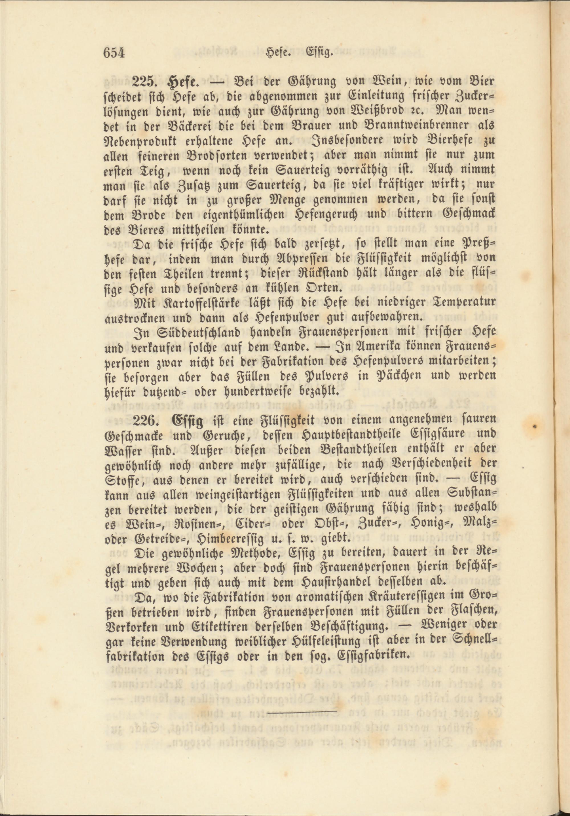 In Süddeutschland handeln Frauenspersonen mit frischer Hefe und verkaufen solche auf dem Lande. — In Amerika können Frauenspersonen zwar nicht bei der Fabrikation des Hefenpulvers mitarbeiten; sie besorgen aber das Füllen des Pulvers in Päckchen und werden hiefür dutzend- oder Hundertweise bezahlt.