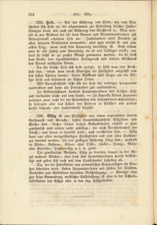 Da, wo die Fabrikation von aromatischen Kräuteressigen im Großen betrieben wird, finden Frauenspersonen mit Füllen der Flaschen, Verkorken und Etikettiren derselben Beschäftigung. — Weniger oder gar keine Verwendung weiblicher Hülfeleistung ist aber in der Schnell- fabrikation des Essigs oder in den sog. Essigfabriken.