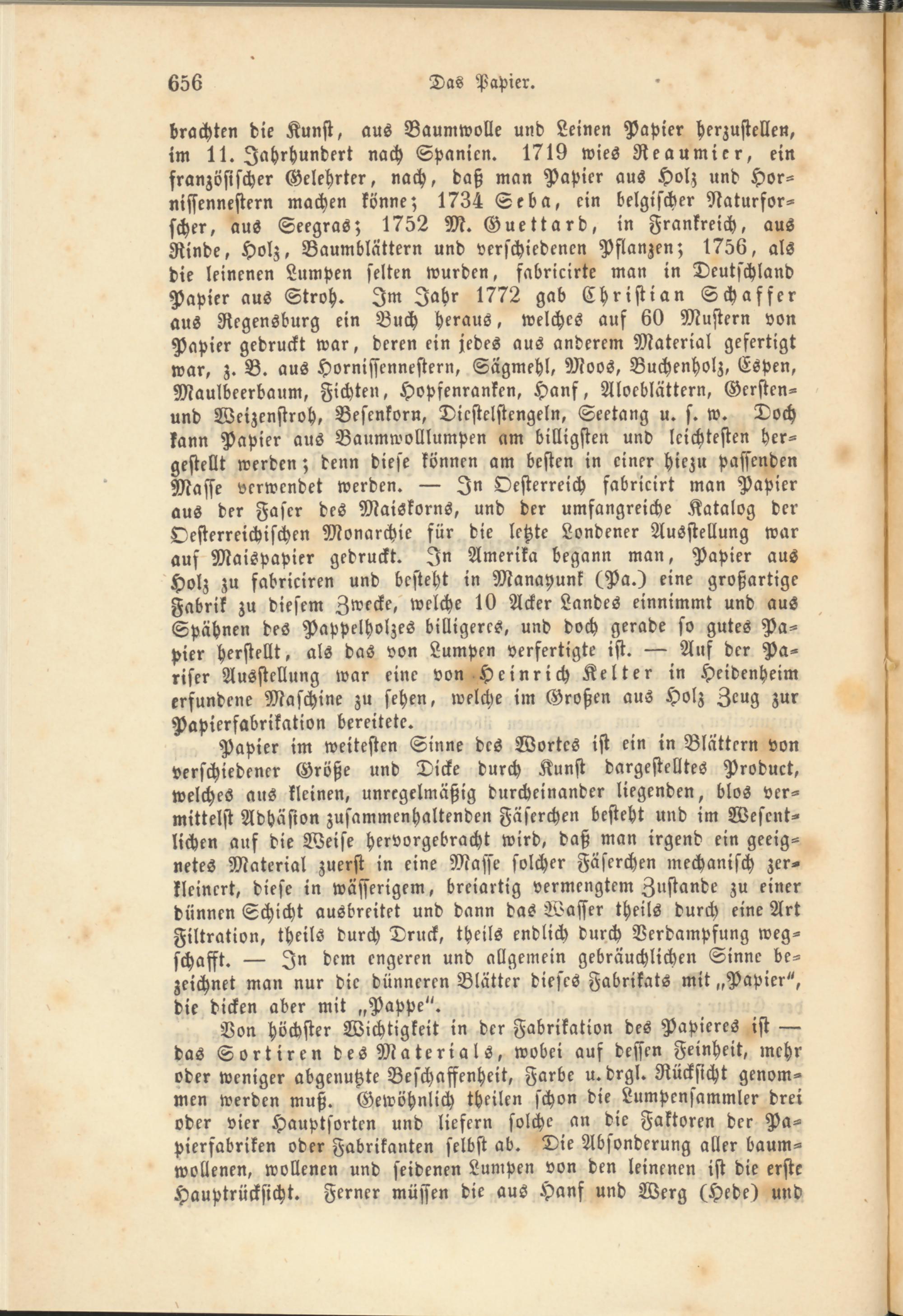 brachten die Kunst, aus Baumwolle und Leinen Papier herzustellen, im 11. Jahrhundert nach Spanien. 1719 wies Reaumier, ein französischer Gelehrter, nach, daß man Papier aus Hol; und Hor- nissennestern machen könne; 1734 Seba, ein belgischer Naturforscher, aus Seegras; 1752 M. Guettard, in Frankreich, aus Rinde, Holz, Baumblättern und verschiedenen Pflanzen; 1756, als die leinenen Lumpen selten wurden, fabricirte man in Deutschland Papier aus Stroh. Im Jahr 1772 gab Christian Schaffet aus Regensburg ein Buch heraus, welches auf 60 Mustern von Papier gedruckt war, deren ein jedes aus anderem Material gefertigt war, z. B. aus Hornifsennestern, Sagmehl, Moos, Buchenholz, Espen, Maulbeerbaum, Fichten, Hopsenranken, Hanf, Aloeblättern, Gersten- und Weizenstroh, Besenkorn, Dicstelstengeln, Seetang u. s. w. Doch kann Papier aus Baumwolllumpen am billigsten und leichtesten hergestellt werden; denn diese können am besten in einer hiezu passenden Masse verwendet werden. — In Oesterreich fabricirt man Papier aus der Faser des Maiskorns, und der umfangreiche Katalog der Oesterreichischen Monarchie für die letzte Londener Ausstellung war aus Maispapier gedruckt. In Amerika begann man, Papier aus Holz zu fabriciren und besteht in Manayunk (Pa.) eine großartige Fabrik zu diesem Zwecke, welche 10 Acker Landes einnimmt und aus Spähnen des Pappelholzes billigeres, und doch gerade so gutes Papier herstellt, als das von Lumpen verfertigte ist. — Auf der Pariser Ausstellung war eine von Heinrich Kelter in Heidenheim erfundene Maschine zu sehen, welche im Großen aus Holz Zeug zur Papierfabrikation bereitete.