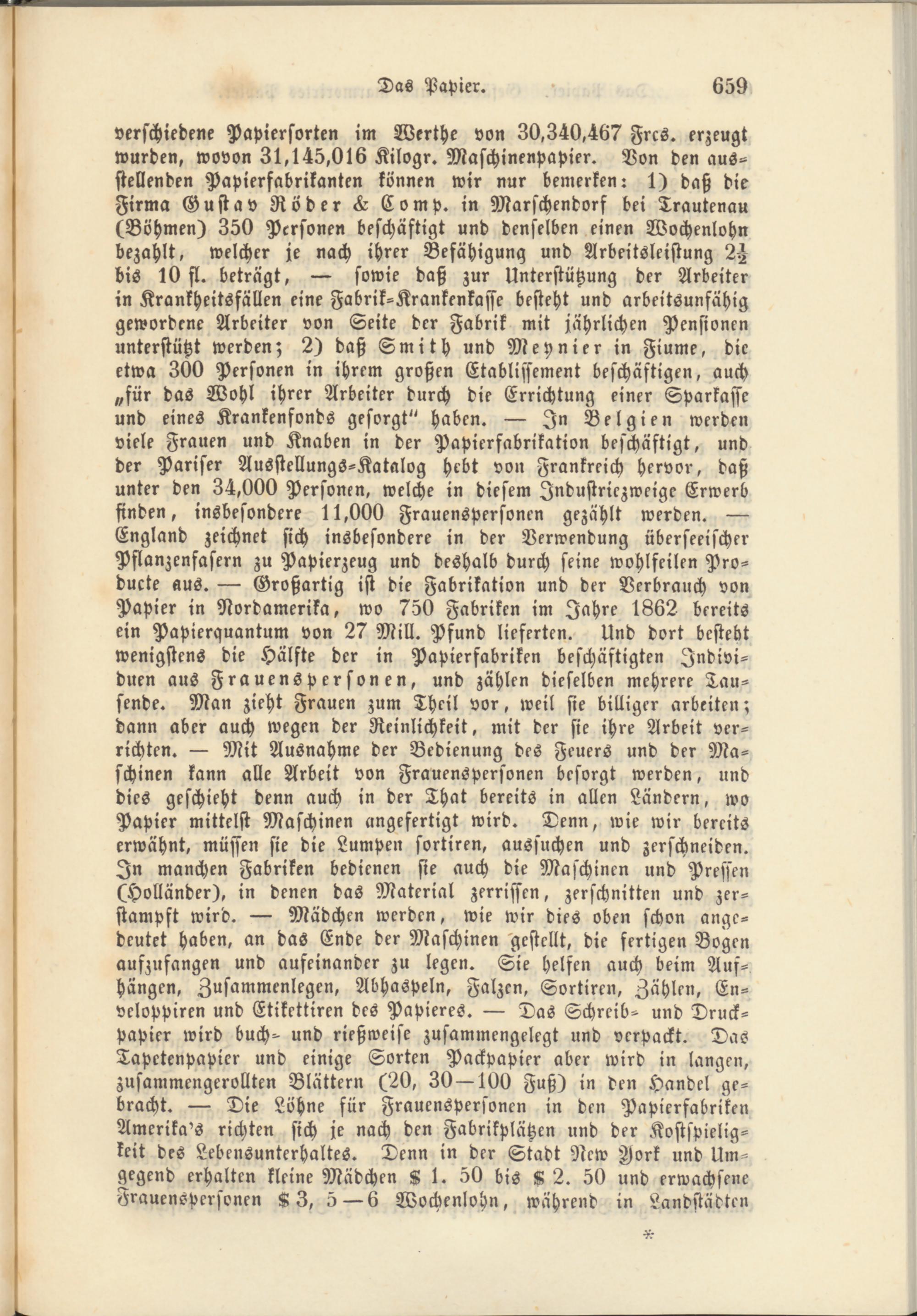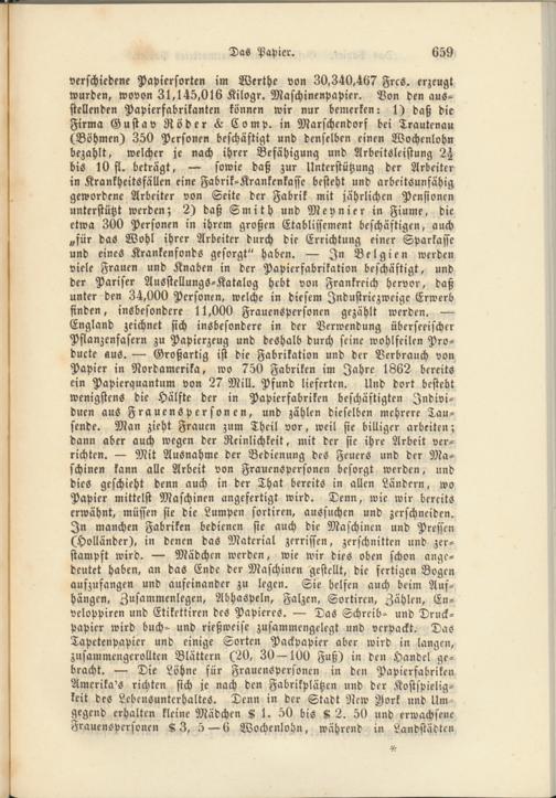 verschiedene Papiersorten im Werthe von 30,340,467 Frcs. erzeugt wurden, wovon 31,145,016 Kilogr. Maschinenpapier. Von den ausstellenden Papierfabrikanten können wir nur bemerken: 1) daß die Firma Gustav Rüder L Comp. in Marschendorf bei Trautenau (Böhmen) 350 Personen beschäftigt und denselben einen Wochenlohn bezahlt, welcher je nach ihrer Befähigung und Arbeitsleistung 2H bis 10 st. beträgt, — sowie daß zur Unterstützung der Arbeiter in Krankheitsfällen eine Fabrik-Krankenkasse besteht und arbeitsunfähig gewordene Arbeiter von Seite der Fabrik mit jährlichen Pensionen unterstützt werden; 2) daß Smith und Meynier in Fiume, die etwa 300 Personen in ihrem großen Etablissement beschäftigen, auch „für das Wohl ihrer Arbeiter durch die Errichtung einer Sparkasse und eines Krankenfonds gesorgt" haben. — In Belgien werden viele Frauen und Knaben in der Papierfabrikation beschäftigt, und der Pariser Ausstellungs-Katalog hebt von Frankreich hervor, daß unter den 34,000 Personen, welche in diesem Industriezweige Erwerb finden, insbesondere 11,000 Frauenspersonen gezählt werden. — England zeichnet sich insbesondere in der Verwendung überseeischer Pflanzenfasern zu Papierzeug und deshalb durch seine wohlfeilen Produkte aus. — Großartig ist die Fabrikation und der Verbrauch von Papier in Nordamerika, wo 750 Fabriken im Jahre 1862 bereits ein Papierquantum von 27 Mill. Pfund lieferten. Und dort besteht wenigstens die Hälfte der in Papierfabriken beschäftigten Individuen aus Frauenspersonen, und zählen dieselben mehrere Lausende. Man zieht Frauen zum Theil vor, weil sie billiger arbeiten; dann aber auch wegen der Reinlichkeit, mit der sie ihre Arbeit verrichten. — Mit Ausnahme der Bedienung des Feuers und der Maschinen kann alle Arbeit von Frauenspersonen besorgt werden, und dies geschieht denn auch in der That bereits in allen Ländern, wo Papier mittelst Maschinen angefertigt wird. Denn, wie wir bereits erwähnt, müssen sie die Lumpen sortiren, aussuchen und zerschneiden. In manchen Fabriken bedienen sie auch die Maschinen und Pressen (Holländer), in denen das Material zerrissen, zerschnitten und zerstampft wird. — Mädchen werden, wie wir dies oben schon angedeutet haben, an das Ende der Maschinen gestellt, die fertigen Bogen aufzufangen und aufeinander zu legen. Sie helfen auch beim Aushängen, Zusammenlegen, Abhaspeln, Falzen, Sortiren, Zählen, En- veloppiren und Etikettiren des Papieres. — Das Schreib- und Druckpapier wird buch- und rießweise zusammengelegt und verpackt. Das Tapetenpapier und einige Sorten Packpapier aber wird in langen, zusammengerollten Blättern (20, 30 — 100 Fuß) in den Handel gebracht. — Die Löhne für Frauenspersonen in den Papierfabriken Amerika's richten sich je nach den Fabrikplätzen und der Kostspieligkeit des Lebensunterhaltes. Denn in der Stadt New Z)ork und Umgegend erhalten kleine Mädchen K 1. 50 bis H 2. 50 und erwachsene Frauenspersonen §3, 5 — 6 Wochenlohn, während in Landstädten