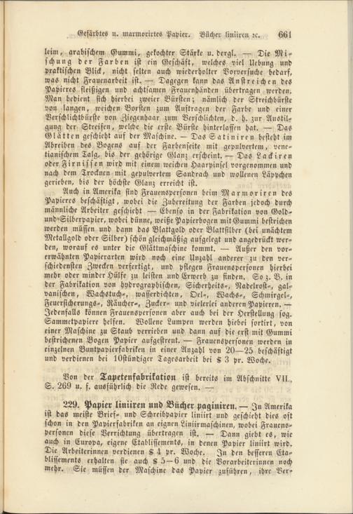 229. Papier limiren und Bücher paginiren. — In Amerika ist das meiste Brief- und Schreibpapier liniirt und geschieht dies oft schon in den Papierfabriken an eignen Liniirmaschinen, wobei Frauenspersonen diese Verrichtung übertragen ist. — Dann giebt es, wie auch in Europa, eigene Etablissements, in denen Papier liniirt wird. Die Arbeiterinnen verdienen K 4 pr. Woche. In den besseren Etablissements erhalten sie auch K 5 — 6 und die Vorarbeiterinnen noch mehr. Sie müssen der Maschine das Papier zuführen, ihre Ver-
