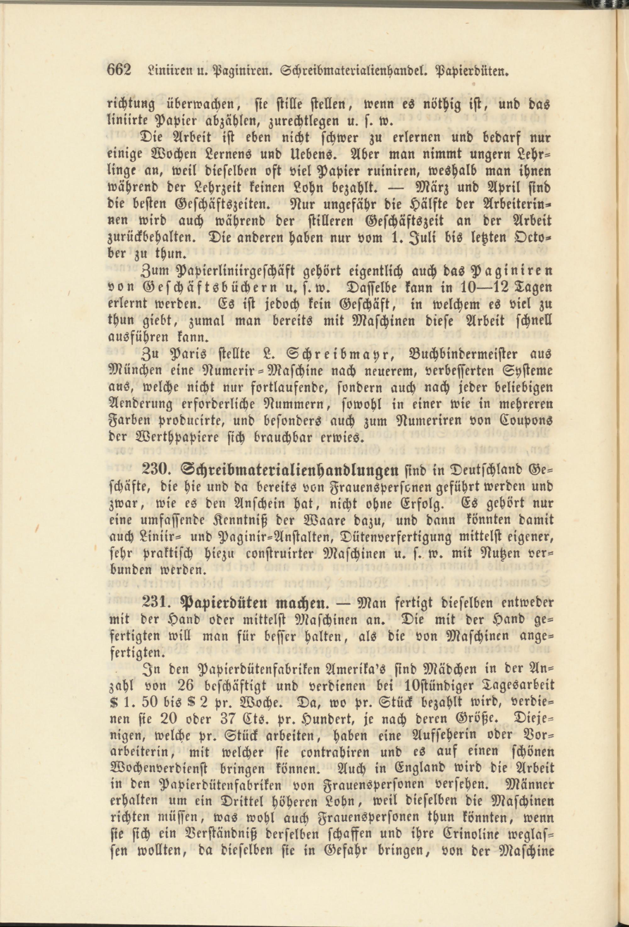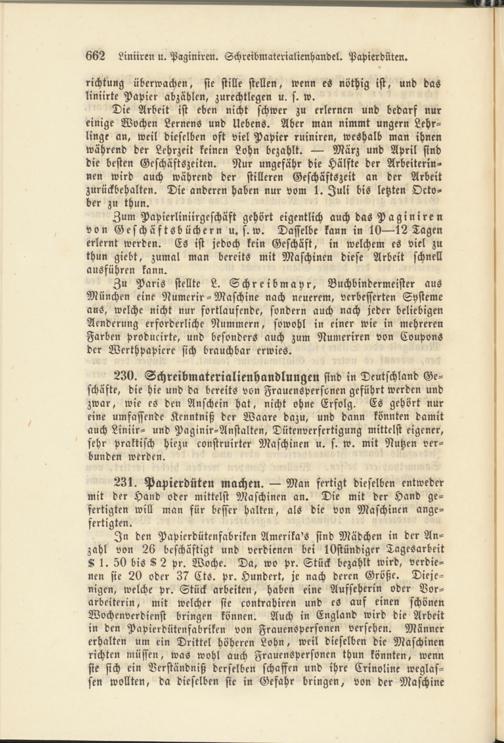 230. Schreibmaterialienhandlungen sind in Deutschland Geschäfte, die hie und da bereits von Frauenspersonen geführt werden und zwar, wie es den Anschein hat, nicht ohne Erfolg. Es gehört nur eine umfassende Kenntniß der Waare dazu, und dann könnten damit auch Liniir- und Paginir-Anstalten, Dütenverfertigung mittelst eigener, sehr praktisch hiezu construirter Maschinen u. s. w. mit Nutzen verbunden werden.