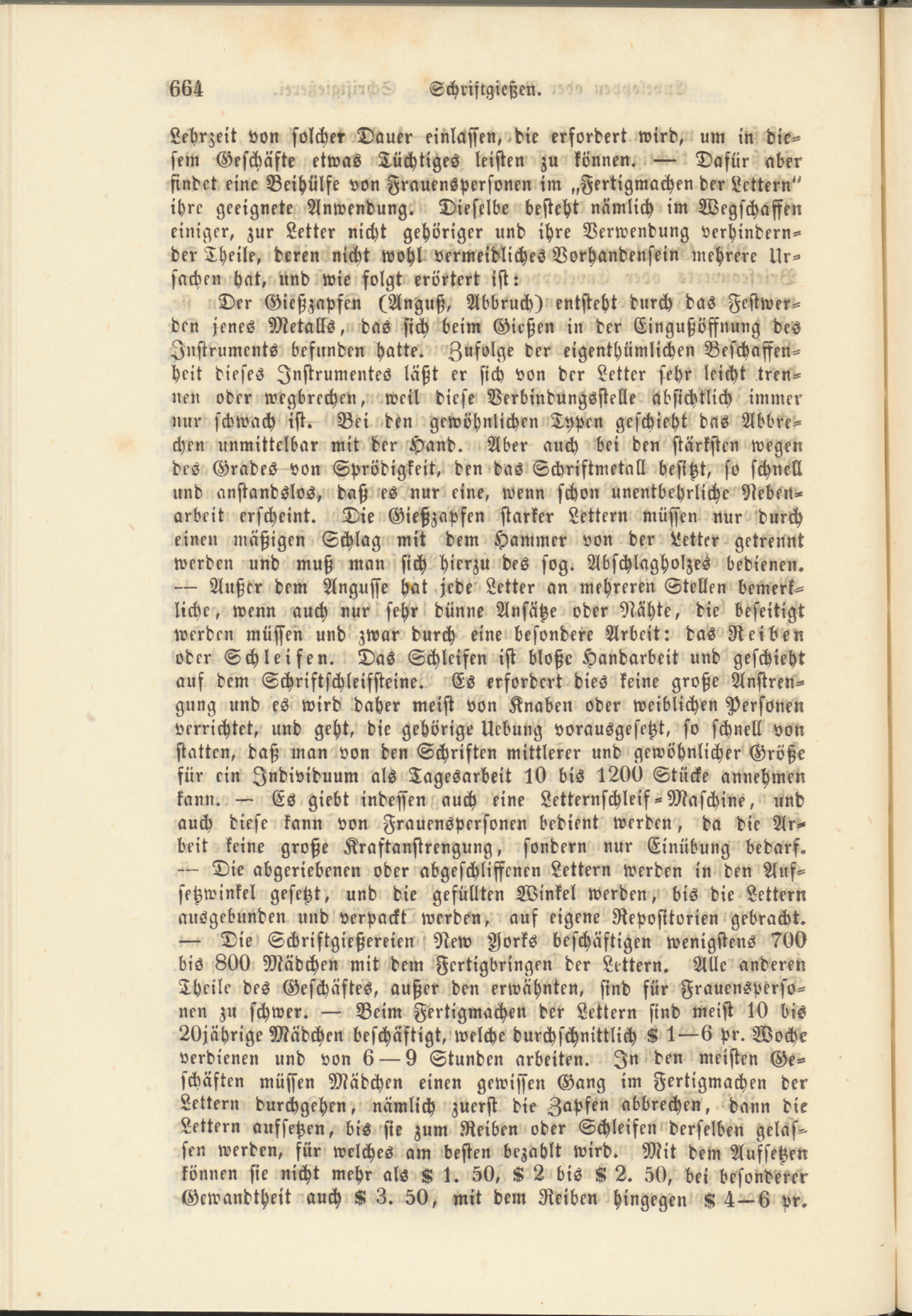 — Die Schriftgießereien New Jorks beschäftigen wenigstens 700 bis 800 Mädchen mit dem Fertigbringen der Lettern. Alle anderen Theile des Geschäftes, außer den erwähnten, sind für Frauenspersonen zu schwer. — Beim Fertigmachen der Lettern sind meist 10 bis 20jährige Mädchen beschäftigt, welche durchschnittlich K 1—6 pr. Woche verdienen und von 6 — 9 Stunden arbeiten. In den meisten Geschäften müssen Mädchen einen gewissen Gang im Fertigmachen der Lettern durchgehen, nämlich zuerst die Zapfen abbrechen, dann die Lettern aufsetzen, bis sie zum Reiben oder Schleifen derselben gelassen werden, für welches am besten bezahlt wird. Mit dem Aufsetzen können sie nicht mehr als K 1. 50, K 2 bis K 2. 50, bei besonderer Gewandtheit auch K 3. 50, mit dem Reiben hingegen H 4—6 pr.