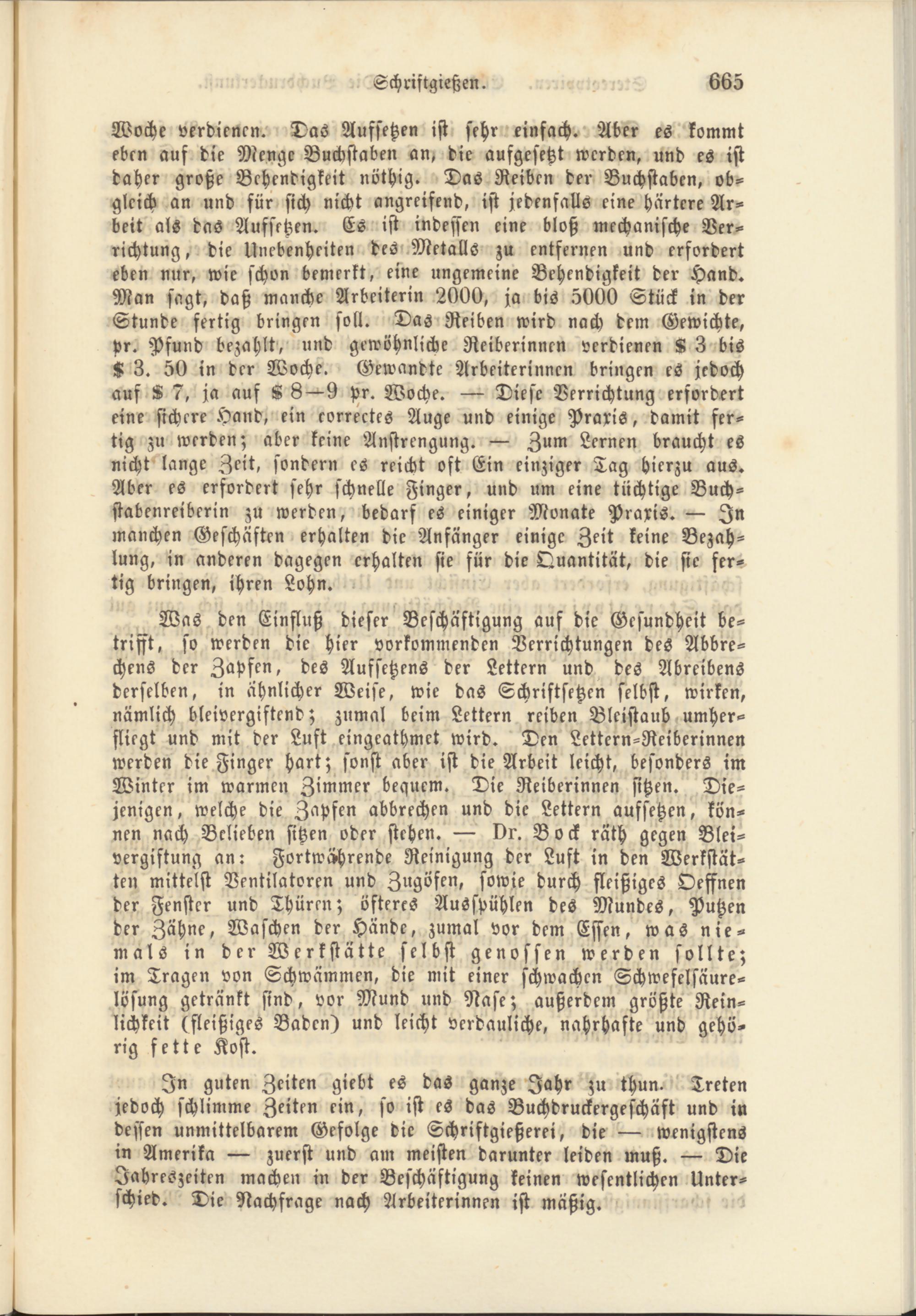 Was den Einfluß dieser Beschäftigung auf die Gesundheit betrifft, so werden die hier vorkommenden Verrichtungen des Abbre- chens der Zapfen, des Aufsetzens der Lettern und des Abreibens derselben, in ähnlicher Weise, wie das Schriftsetzen selbst, wirken, nämlich bleivergiftend; zumal beim Lettern reiben Bleistaub umherfliegt und mit der Lust eingeathmet wird. Den Lettern-Reiberinnen werden die Finger hart; sonst aber ist die Arbeit leicht, besonders im Winter im warmen Zimmer bequem. Die Reiberinnen sitzen. Diejenigen, welche die Zapfen abbrechen und die Lettern aufsetzen, können nach Belieben sitzen oder stehen. — vr. Bock räth gegen Bleivergiftung an: Fortwährende Reinigung der Luft in den Werkstätten mittelst Ventilatoren und Zngöfen, sowie durch fleißiges Oeffnen der Fenster und Thüren; öfteres Ausspühlen des Mundes, Putzen der Zähne, Waschen der Hände, zumal vor dem Essen, was niemals in der Werkftätte selbst genossen werden sollte; im Tragen von Schwämmen, die mit einer schwachen Schwefelsäure- lösung getränkt sind, vor Mund und Nase; außerdem größte Reinlichkeit (fleißiges Baden) und leicht verdauliche, nahrhafte und gehörig fette Kost.