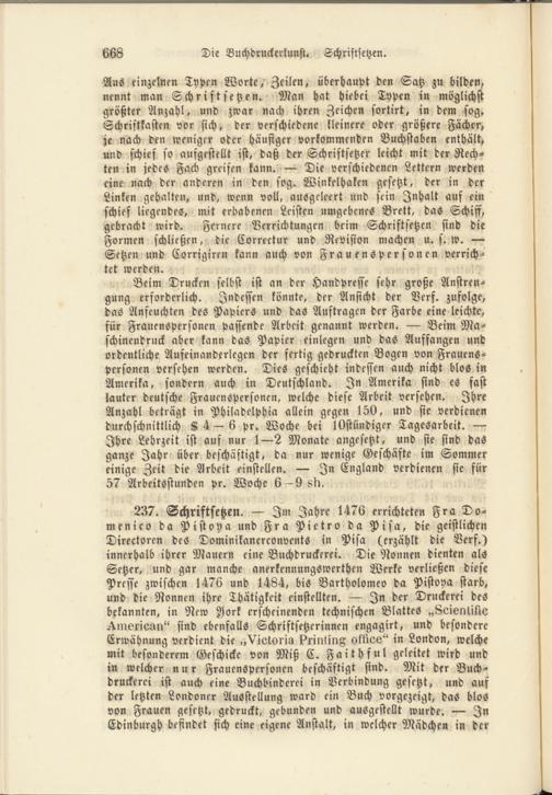 237. Schriftsetzern — Im Jahre 1476 errichteten Fra Dorn enico da Pistoya und Fra Pietro da Pisa, die geistlichen Directoren des Dominikanerconvents in Pisa (erzählt die Verf.) innerhalb ihrer Mauern eine Buchdruckerei. Die Nonnen dienten als Setzer, und gar manche anerkennungswerthen Werke verließen diese Presse zwischen 1476 und 1484, bis Bartholomeo da Pistoya starb, und die Nonnen ihre Thätigkeit einstellten. — In der Druckerei des bekannten, in New Jork erscheinenden technischen Blattes „lveientiüc .4merieao" sind ebenfalls Schriftsetzcrinnen engagirt, und besondere Erwähnung verdient die „Victoria prinlinx ol'üeo" in London, welche mit besonderem Geschicke von Miß C. Faithful geleitet wird und in welcher nur Frauenspersonen beschäftigt sind. Mit der Buchdruckerei ist auch eine Buchbinderei in Verbindung gesetzt, und auf der letzten Londoner Ausstellung ward ein Buch vorgezeigt, das blos von Frauen gesetzt, gedruckt, gebunden und ausgestellt wurde. — In Edinburgh befindet sich eine eigene Anstalt, in welcher Mädchen in der