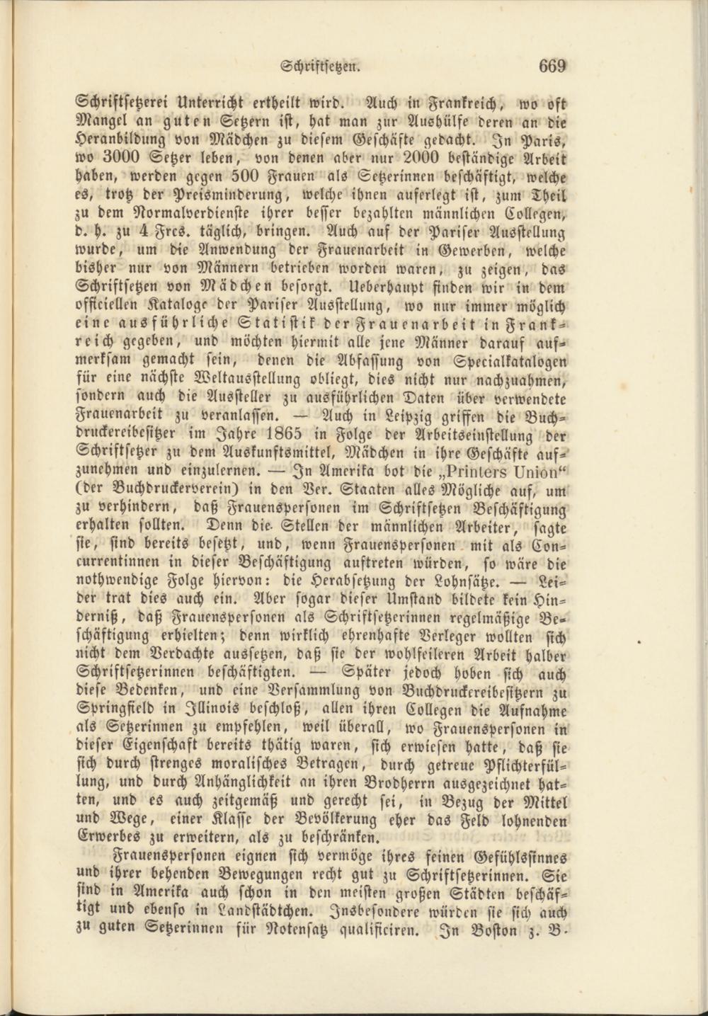 Frauenspersonen eignen sich vermöge ihres feinen Gefühlssinnes und ihrer behenden Bewegungen recht gut zu Schriftsetzerinnen. Sie sind in Amerika auch schon in den meisten großen Städten beschäftigt und ebenso in Landstädtchen. Insbesondere würden sie sich auch zu guten Setzerinnen für Notensatz qualificiren. In Boston z. B-