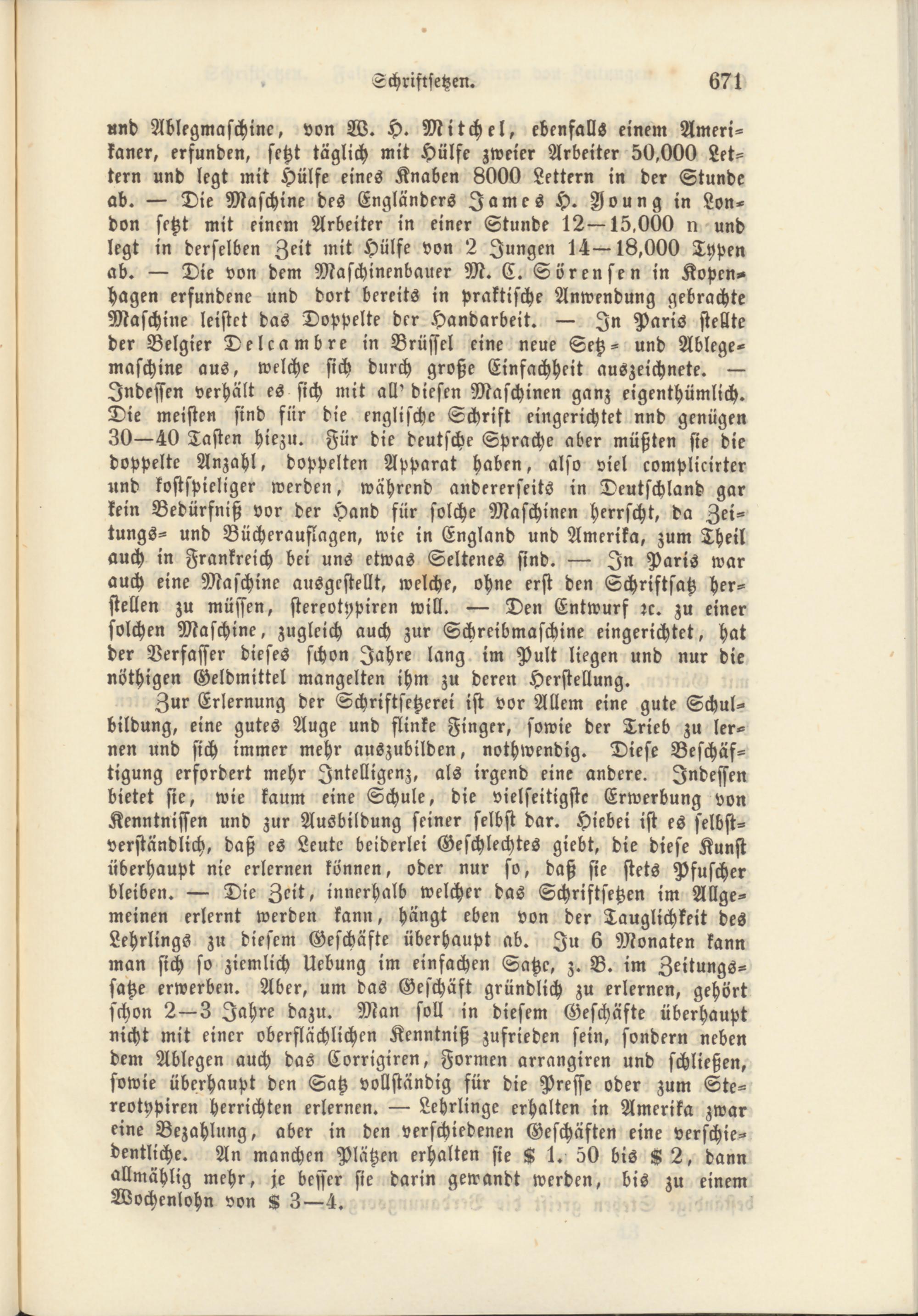 Zur Erlernung der Schriftsetzer« ist vor Allem eine gute Schulbildung, eine gutes Auge und stinke Finger, sowie der Trieb zu lernen und sich immer mehr auszubilden, nothwendig. Diese Beschäftigung erfordert mehr Intelligenz, als irgend eine andere. Indessen bietet sie, wie kaum eine Schule, die vielseitigste Erwerbung von Kenntnissen und zur Ausbildung seiner selbst dar. Hiebei ist es selbstverständlich, daß es Leute beiderlei Geschlechtes giebt, die diese Kunst überhaupt nie erlernen können, oder nur so, daß sie stets Pfuscher bleiben. — Die Zeit, innerhalb welcher das Schriftsetzen im Allgemeinen erlernt werden kann, hängt eben von der Tauglichkeit des Lehrlings zu diesem Geschäfte überhaupt ab. Ju 6 Monaten kann man sich so ziemlich Uebung im einfachen Satze, z. B. im Zeitungssatze erwerben. Aber, um das Geschäft gründlich zu erlernen, gehört schon 2—3 Jahre dazu. Man soll in diesem Geschäfte überhaupt nicht mit einer oberflächlichen Kenntniß zufrieden sein, sondern neben dem Ablegen auch das Corrigiren, Formen arrangiren und schließen, sowie überhaupt den Satz vollständig für die Presse oder zum Stereotypiren Herrichten erlernen. — Lehrlinge erhalten in Amerika zwar eine Bezahlung, aber in den verschiedenen Geschäften eine verschiedentlich« An manchen Plätzen erhalten sie S 1. 50 bis K 2, dann allmählig mehr, je besser sie darin gewandt werden, bis zu einem Wochenlohn von S 3—4.