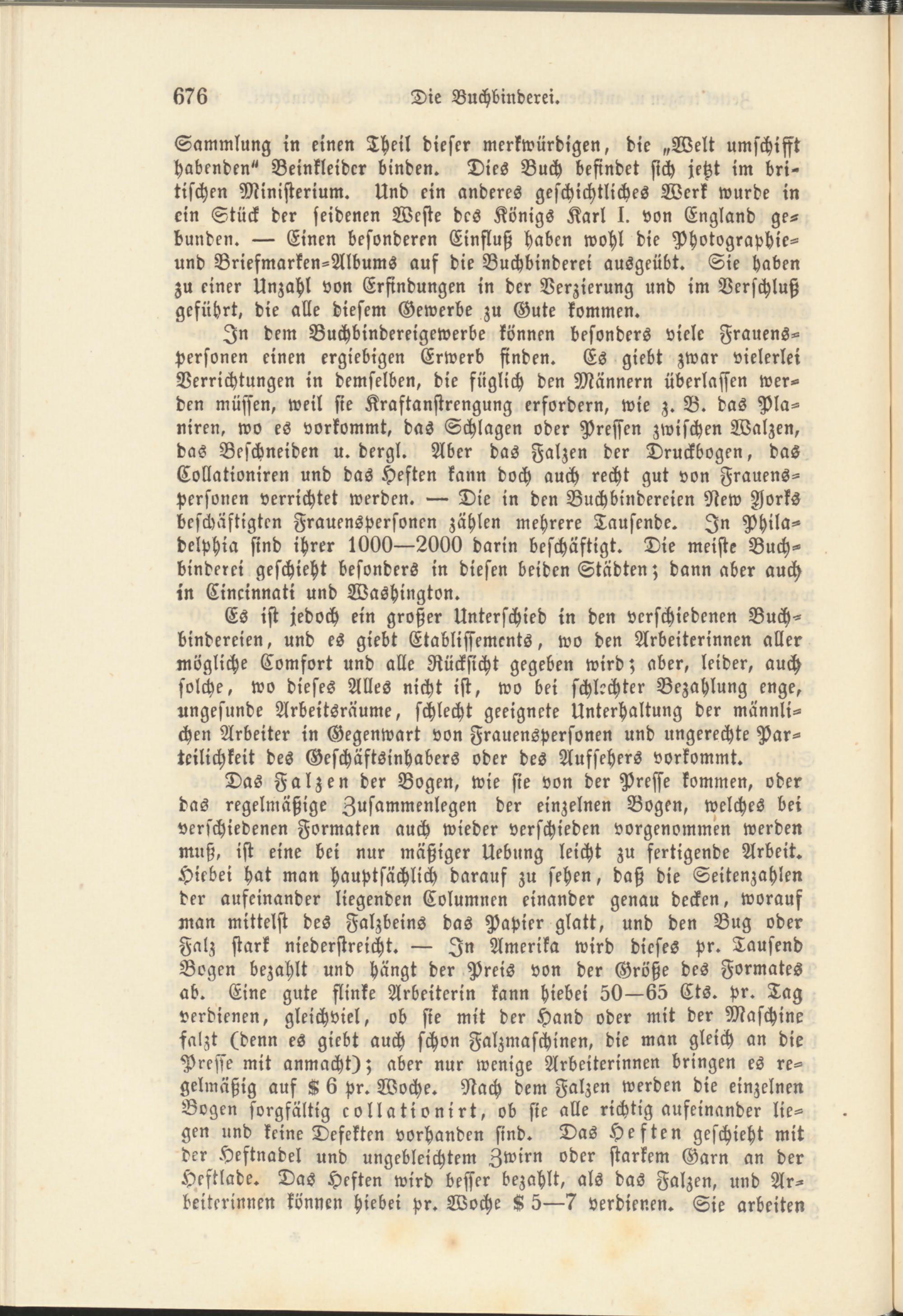 Das Falzen der Bogen, wie sie von der Presse kommen, oder das regelmäßige Zusammenlegen der einzelnen Bogen, welches bei verschiedenen Formaten auch wieder verschieden vorgenommen werden muß, ist eine bei nur mäßiger Uebung leicht zu fertigende Arbeit. Hiebei hat man hauptsächlich darauf zu sehen, daß die Seitenzahlen der aufeinander liegenden Columnen einander genau decken, worauf man mittelst des Falzbeins das Papier glatt, und den Bug oder Falz stark niederstreicht. — In Amerika wird dieses pr. Tausend Bogen bezahlt und hängt der Preis von der Größe des Formates ab. Eine gute flinke Arbeiterin kann Hiebei 50—65 Cts. pr. Tag verdienen, gleichviel, ob sie mit der Hand oder mit der Maschine falzt (denn es giebt auch schon Falzmaschinen, die man gleich an die Presse mit anmacht); aber nur wenige Arbeiterinnen bringen es regelmäßig auf K 6 pr. Woche. Nach dem Falzen werden die einzelnen Bogen sorgfältig collationirt, ob sie alle richtig aufeinander liegen und keine Defekten vorhanden sind. Das Heften geschieht mit der Heftnadel und ungebleichtem Zwirn oder starkem Garn an der Heftlade. Das Heften wird besser bezahlt, als das Falzen, und Arbeiterinnen können Hiebei pr. Woche K 5—7 verdienen. Sie arbeiten