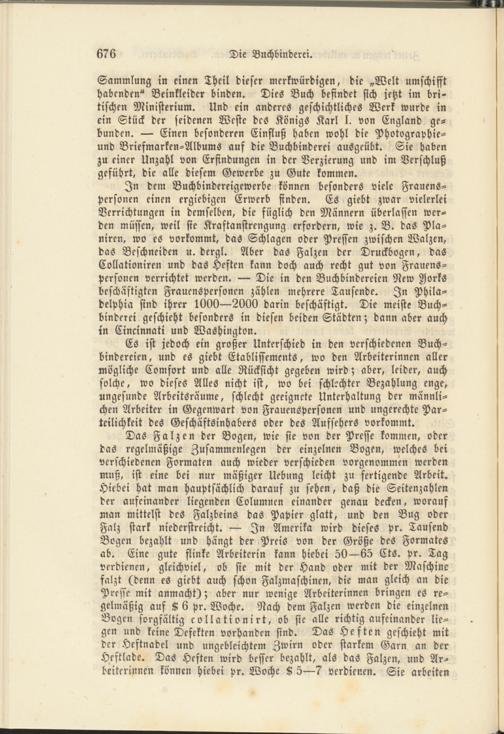 In dem Buchbindereigewerbe können besonders viele Frauenspersonen einen ergiebigen Erwerb finden. Es giebt zwar vielerlei Verrichtungen in demselben, die füglich den Männern überlassen werden müssen, weil sie Kraftanstrengung erfordern, wie z. B. das Planiren, wo es vorkommt, das Schlagen oder Pressen zwischen Walzen, das Beschneiden u. dergl. Aber das Falzen der Druckbogen, das Collationiren und das Heften kann doch auch recht gut von Frauenspersonen verrichtet werden. — Die in den Buchbindereien New Jorks beschäftigten Frauenspersonen zählen mehrere Tausende. In Philadelphia sind ihrer 1000—2000 darin beschäftigt. Die meiste Buchbinderei geschieht besonders in diesen beiden Städten; dann aber auch in Cincinnati und Washington.
