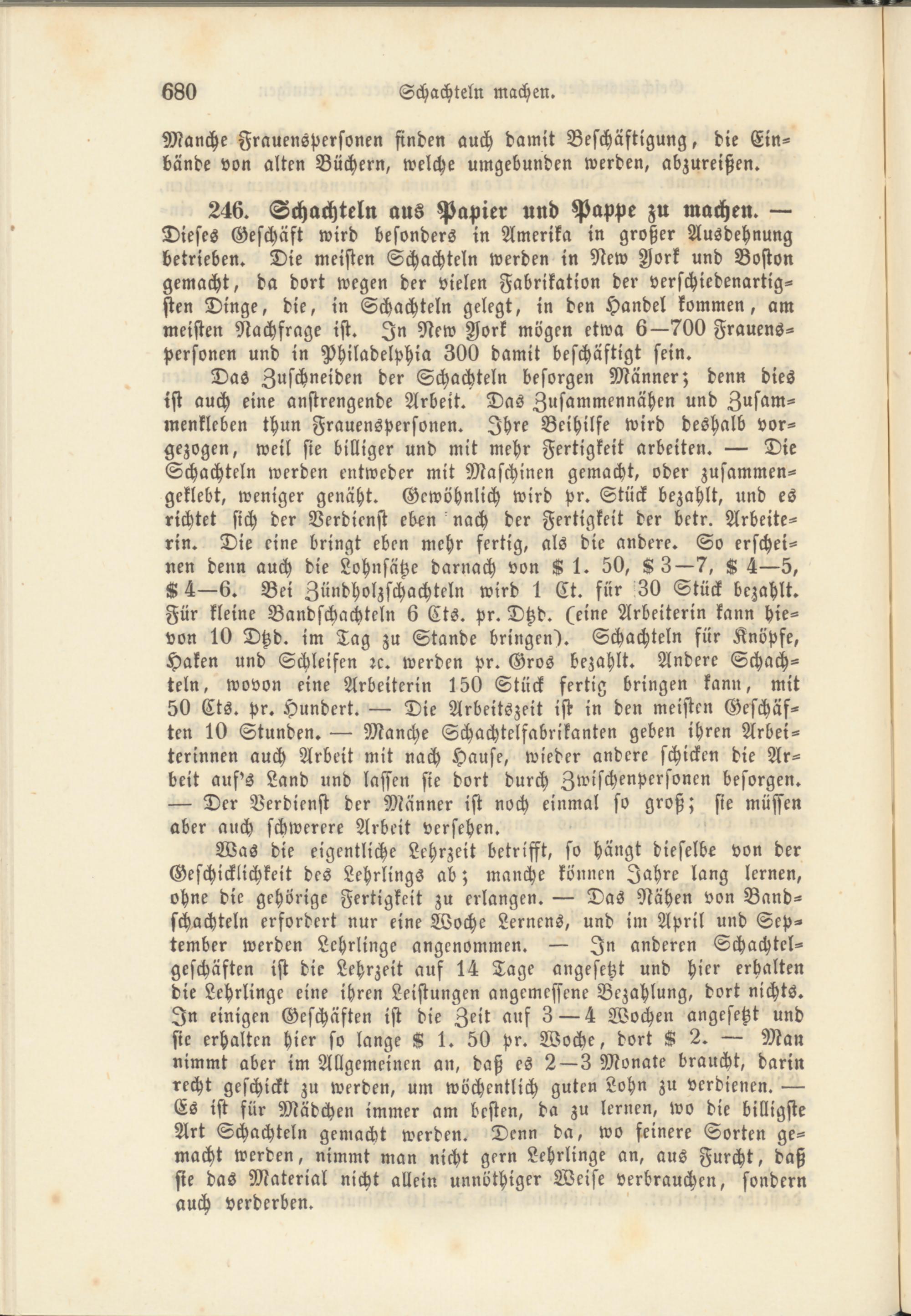 246. Schachteln aus Papier und Pappe zu machen. — Dieses Geschäft wird besonders in Amerika in großer Ausdehnung betrieben. Die meisten Schachteln werden in New Jork und Boston gemacht, da dort wegen der vielen Fabrikation der verschiedenartigsten Dinge, die, in Schachteln gelegt, in den Handel kommen, am meisten Nachfrage ist. In New Aork mögen etwa 6—700 Frauenspersonen und in Philadelphia 300 damit beschäftigt sein.
