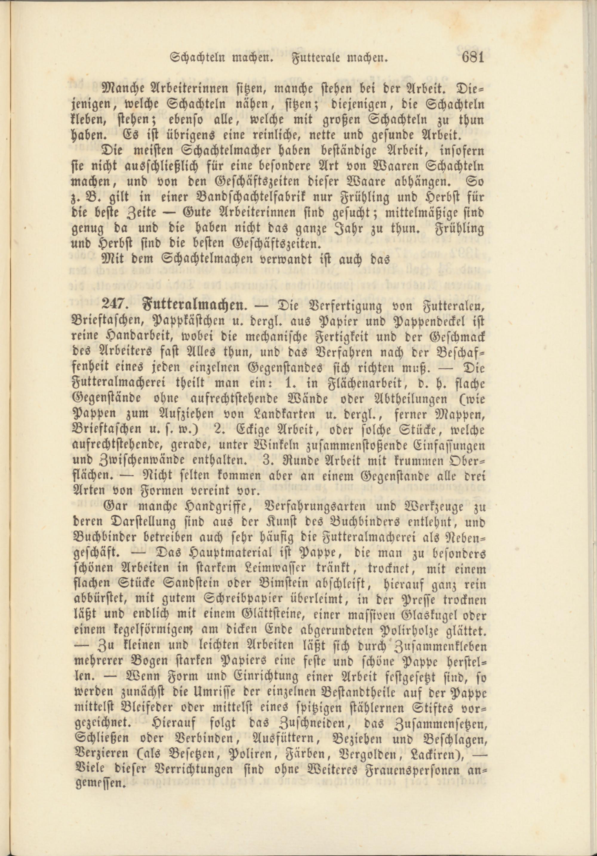 Gar manche Handgriffe, Verfahrungsarten und Werkzeuge zu deren Darstellung sind aus der Kunst des Buchbinders entlehnt, und Buchbinder betreiben auch sehr häufig die Futteralmacherei als Neben- geschäft. — Das Hauptmaterial ist Pappe, die man zu besonders schönen Arbeiten in starkem Leimwasscr tränkt, trocknet, mit einem flachen Stücke Sandstein oder Bimstein abschleift, hierauf ganz rein abbürstet, mit gutem Schreibpapier überleimt, in der Presse trocknen läßt und endlich mit einem Glättsteine, einer massiven Glaskugel oder einem kegelförmigen? am dicken Ende abgerundeten Polirholze glättet. — Zu kleinen und leichten Arbeiten läßt sich durch'Zusammenkleben mehrerer Bogen starken Papiers eine feste und schöne Pappe herstellen. — Wenn Form und Einrichtung einer Arbeit festgesetzt sind, so werden zunächst die Umrisse der einzelnen Bestandtheile auf der Pappe mittelst Bleifeder oder mittelst eines spitzigen stählernen Stiftes vor- gezeichnet. Hierauf folgt das Zuschneiden, das Zusammensetzen, Schließen oder Verbinden, Ausfüttern, Beziehen und Beschlagen, Verzieren (als Besetzen, Poliren, Färben, Vergolden, Lackiren), — Viele dieser Verrichtungen sind ohne Weiteres Frauenspersonen angemessen.
