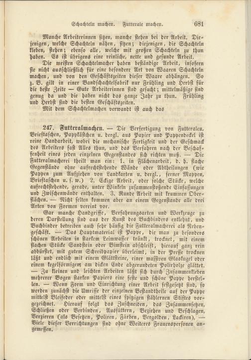 241. Futteralmachen. — Die Verfertigung von Futteralen, Brieftaschen, Pappkästchen u. dergl. aus Papier und Pappendeckel ist reine Handarbeit, wobei die mechanische Fertigkeit und der Geschmack des Arbeiters fast Alles thun, und das Verfahren nach der Beschaffenheit eines jeden einzelnen Gegenstandes sich richten muß. — Die Futteralmacherei theilt man ein: 1. in Flächenarbeit, d. h. stäche Gegenstände ohne aufrechtstehende Wände oder Abtheilungen (wie Pappen zum Aufziehen von Landkarten u. dergl., ferner Mappen, Brieftaschen u. s. w.) 2. Eckige Arbeit, oder solche Stücke, welche aufrechtstehcnde, gerade, unter Winkeln zusammenstoßende Einfassungen und Zwischenwände enthalten. 3. Runde Arbeit mit krummen Oberflächen. — Nicht selten kommen aber an einem Gegenstände alle drei Arten von Formen vereint vor.