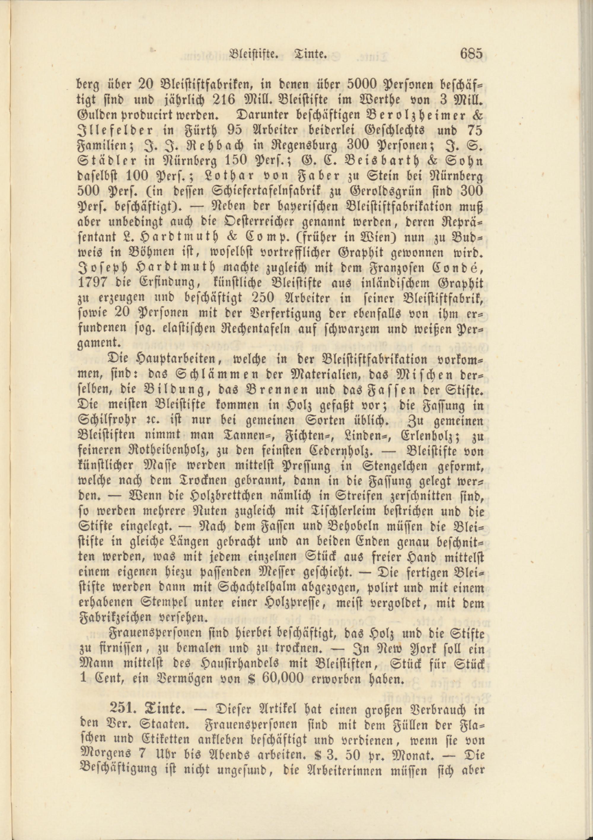 berg über 20 Bleistiftfabriken, in denen über 5000 Personen beschäftigt sind und jährlich 216 Mill. Bleistifte im Werthe von 3 Mill. Gulden producirt werden. Darunter beschäftigen Berolzheimer L Jllefelder in Fürth 95 Arbeiter beiderlei Geschlechts und 75 Familien; I. I. Rehbach in Regensburg 300 Personen; I. S. Städler in Nürnberg 150 Pers.; G. C. Beisbarth är Sohn daselbst 100 Pers.; Lothar von Faber zu Stein bei Nürnberg 500 Pers. (in dessen Schiefcrtafelnfabrik zu Geroldsgrün sind 300 Pers. beschäftigt). — Neben der bayerischen Bleistiftfabrikation muß aber unbedingt auch die Oesterreicher genannt werden, deren Repräsentant L. Hardtmuth L Comp. (früher in Wien) nun zu Bud- weis in Böhmen ist, woselbst vortrefflicher Graphit gewonnen wird. Joseph Hardtmuth machte zugleich mit dem Franzosen Conds, 1797 die Erfindung, künstliche Bleistifte aus inländischem Graphit zu erzeugen und beschäftigt 250 Arbeiter in seiner Bleistiftfabrik, sowie 20 Personen mit der Verfertigung der ebenfalls von ihm erfundenen sog. elastischen Rechentafeln auf schwarzem und weißen Pergament.