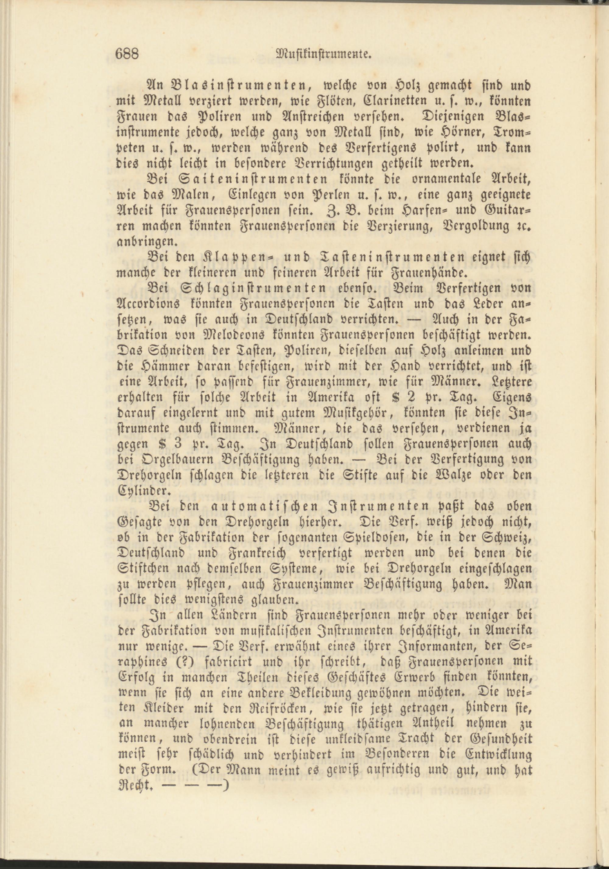 In allen Ländern sind Frauenspersonen mehr oder weniger bei der Fabrikation von musikalischen Instrumenten beschäftigt, in Amerika nur wenige. — Die Verf. erwähnt eines ihrer Informanten, der Se- raphines (?) fabricirt und ihr schreibt, daß Frauenspersonen mit Erfolg in manchen Theilen dieses Geschäftes Erwerb finden könnten, wenn sie sich an eine andere Bekleidung gewöhnen möchten. Die weiten Kleider mit den Rcifröcken, wie sie jetzt getragen, hindern sie, an mancher lohnenden Beschäftigung thätigen Antheil nehmen zu können, und obendrein ist diese unkleidsame Tracht der Gesundheit meist sehr schädlich und verhindert im Besonderen die Entwicklung der Form. (Der Mann meint es gewiß aufrichtig und gut, und hat Recht.-)