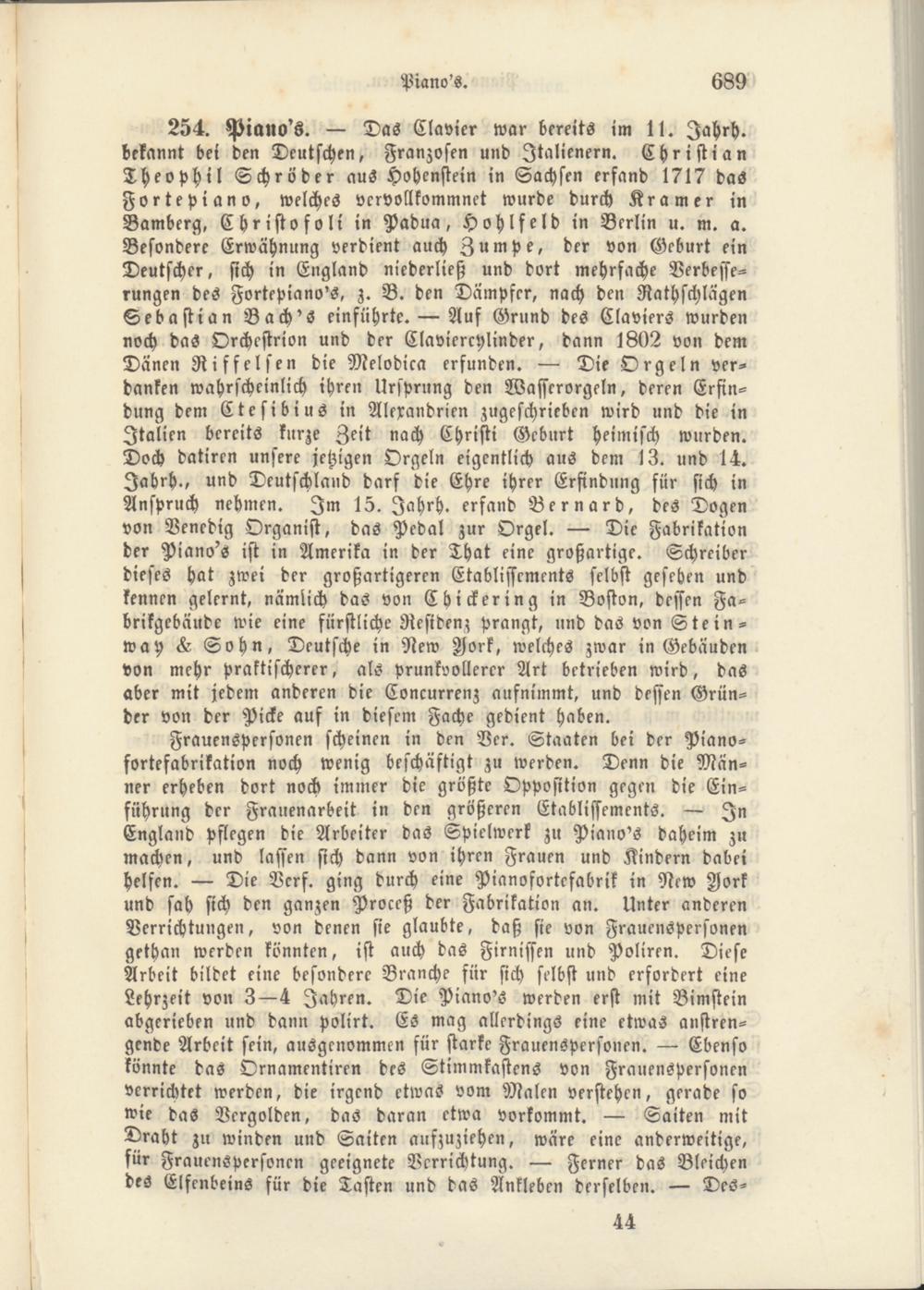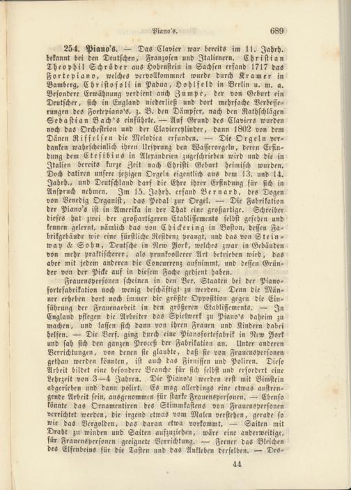 254. Piano's. — Das Clavier war bereits im 11. Jahrh, bekannt bei den Deutschen, Franzosen und Italienern. Christian Theophil Schröder aus Hohenstein in Sachsen erfand 1717 das Fortepiano, welches vervollkommnet wurde durch Krämer in Bamberg, Christo soli in Padua, Hohlfeld in Berlin u. m. a. Besondere Erwähnung verdient auch Zumpe, der von Geburt ein Deutscher, sich in England niederließ und dort mehrfache Verbesserungen des Fortepiano's, z. B. den Dämpfer, nach den Rathschlägen Sebastian Bach's einführte. — Auf Grund des Claviers wurden noch das Orchestrion und der Claviercplinder, dann 1802 von dem Dänen Riffelsen die Melodica erfunden. — Die Orgeln verdanken wahrscheinlich ihren Ursprung den Wasserorgeln, deren Erfindung dem Ctesibius in Alexandrien zugeschrieben wird und die in Italien bereits kurze Zeit nach Christi Geburt heimisch wurden. Doch datiern unsere jetzigen Orgeln eigentlich aus dem 13. und 14. Jahrh., und Deutschland darf die Ehre ihrer Erfindung für sich in Anspruch nehmen. Im 15. Jahrh, erfand Bernard, des Dogen von Venedig Organist, das Pedal zur Orgel. — Die Fabrikation der Piano's ist in Amerika in der That eine großartige. Schreiber dieses hat zwei der großartigeren Etablissements selbst gesehen und kennen gelernt, nämlich das von Chickering in Boston, dessen Fabrikgebäude wie eine fürstliche Residenz prangt, nnd das von Stein - way L Sohn, Deutsche in New Ajork, welches zwar in Gebäuden von mehr praktischerer, als prunkvollerer Art betrieben wird, das aber mit jedem anderen die Concurrenz aufnimmt, und dessen Gründer von der Picke auf in diesem Fache gedient haben.