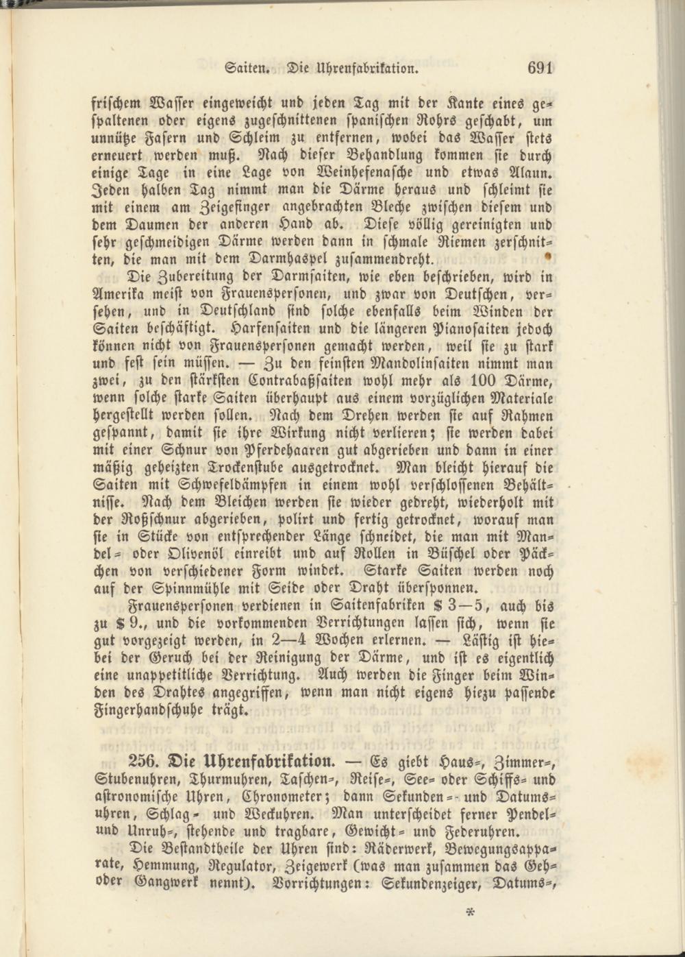 256. Die Uhrenfabrikation. — Es giebt Haus-, Zimmer-, Stubenuhren, Thurmuhren, Taschen-, Reise-, See- oder Schiffs- und astronomische Uhren, Chronometer; dann Sekunden--und Datumsuhren, Schlag- und Weckuhren. Man unterscheidet ferner Pendel- und Unruh-, stehende und tragbare, Gewicht- und Federuhren.