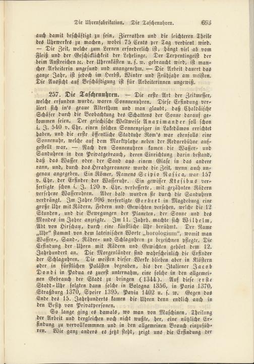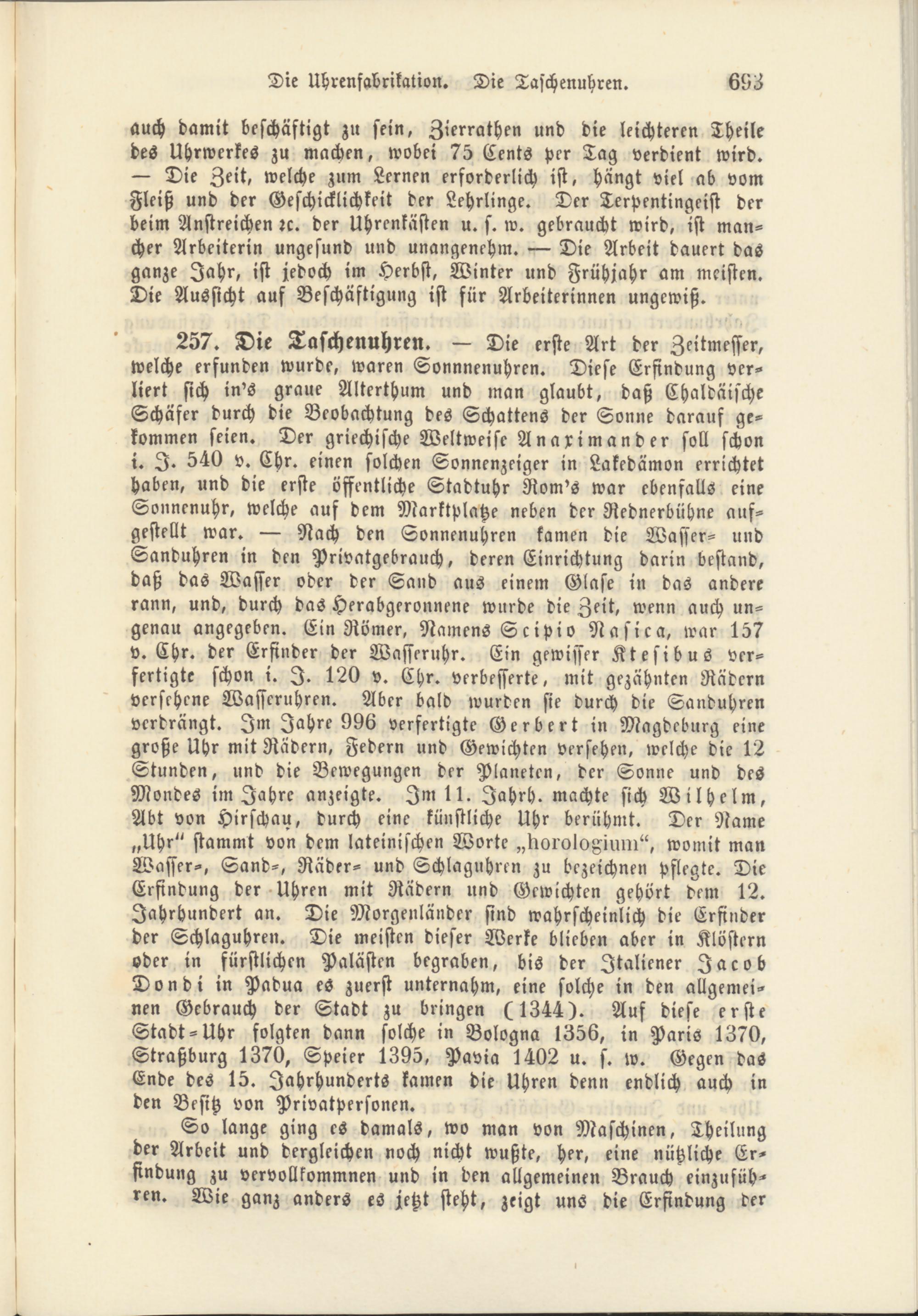 257. Die Taschenuhren. — Die erste Art der Zeitmesser, welche erfunden wurde, waren Sonnnenuhren. Diese Erfindung verliert sich in's graue Alterthum und man glaubt, daß Chaldäische Schäfer durch die Beobachtung des Schattens der Sonne darauf gekommen seien. Der griechische Weltweise Anaximander soll schon i. I. 540 v. Chr. einen solchen Sonnenzeiger in Lakedämon errichtet haben, und die erste öffentliche Stadtuhr Rom's war ebenfalls eine Sonnenuhr, welche auf dem Marktplatze neben der Redner-bühne aufgestellt war. — Nach den Sonnenuhren kamen die Wasser- und Sanduhren in den Privatgebrauch, deren Einrichtung darin bestand, daß das Wasser oder der Sand aus einem Glase in das andere rann, und, durch das Herabgeronnene wurde die Zeit, wenn auch ungenau angegeben. Ein Römer, Namens Scipio Nasica, war 157 v. Chr. der Erfinder der Wasseruhr. Ein gewisser Ktesibus verfertigte schon i. I. 120 v. Chr. verbesserte, mit gezahnten Rädern versehene Wasseruhren. Aber bald wurden sie durch die Sanduhren verdrängt. Im Jahre 996 verfertigte Gerbert in Magdeburg eine große Uhr mit Rädern, Federn und Gewichten versehen, welche die 12 Stunden, und die Bewegungen der Planeten, der Sonne und des Mondes im Jahre anzeigte. Im 11. Jahrh, machte sich Wilhelm, Abt von Hirschau, durch eine künstliche Uhr berühmt. Der Name „Uhr" stammt von dem lateinischen Worte „Uoroloxium", womit man Wasser-, Sand-, Räder- und Schlaguhren zu bezeichnen pflegte. Die Erfindung der Uhren mit Rädern und Gewichten gehört dem 12. Jahrhundert an. Die Morgenländer sind wahrscheinlich die Erfinder der Schlaguhren. Die meisten dieser Werke blieben aber in Klöstern oder in fürstlichen Palästen begraben, bis der Italiener Jacob Dondi in Padua es zuerst unternahm, eine solche in den allgemeinen Gebrauch der Stadt zu bringen (1344). Auf diese erste Stadt-Uhr folgten dann solche in Bologna 1356, in Paris 1370, Straßburg 1370, Speier 1395, Pavia 1402 u. s. w. Gegen das Ende des 15. Jahrhunderts kamen die Uhren denn endlich auch in den Besitz von Privatpersonen.