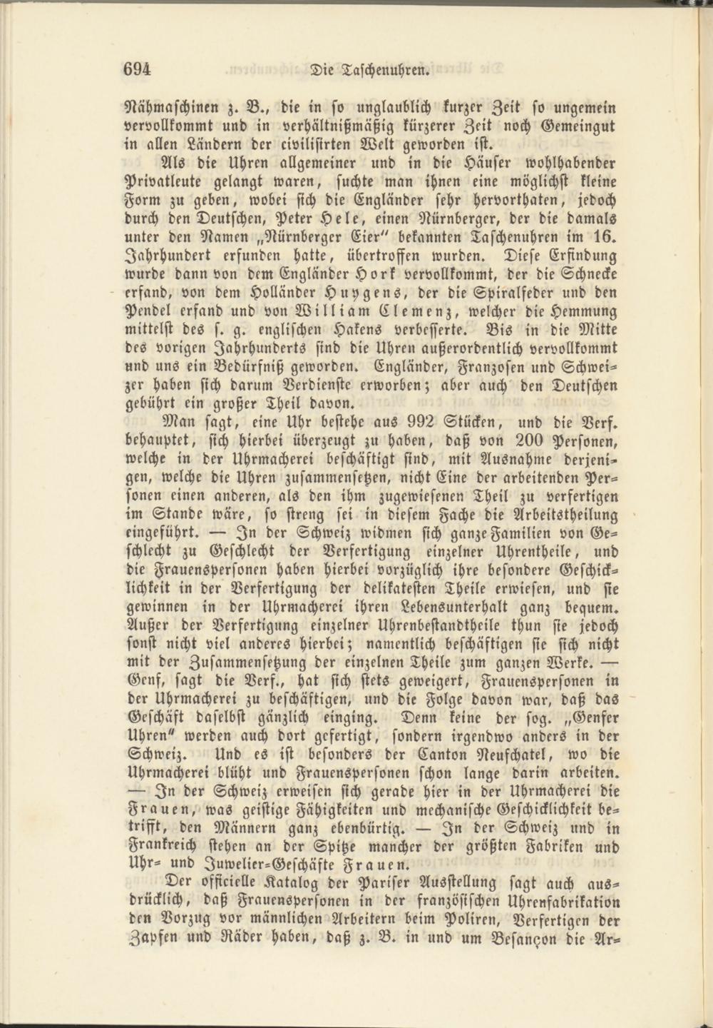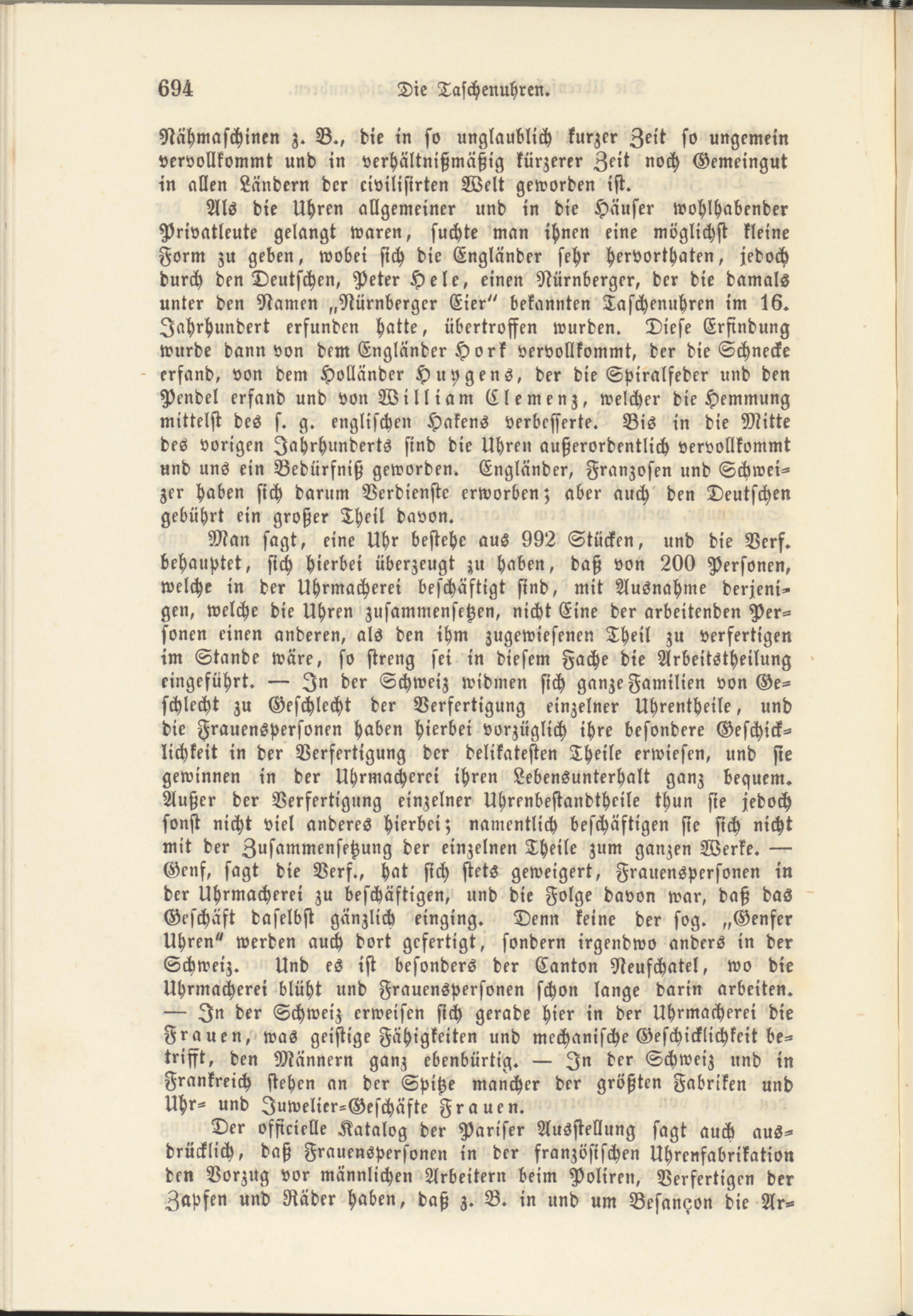 Der officielle Katalog der Pariser Ausstellung sagt auch ausdrücklich, daß Frauenspersonen in der französischen Uhrenfabrikation den Vorzug vor männlichen Arbeitern beim Poliren, Verfertigen der Zapfen und Räder haben, daß z. B. in und um Besan?on die Ar-
