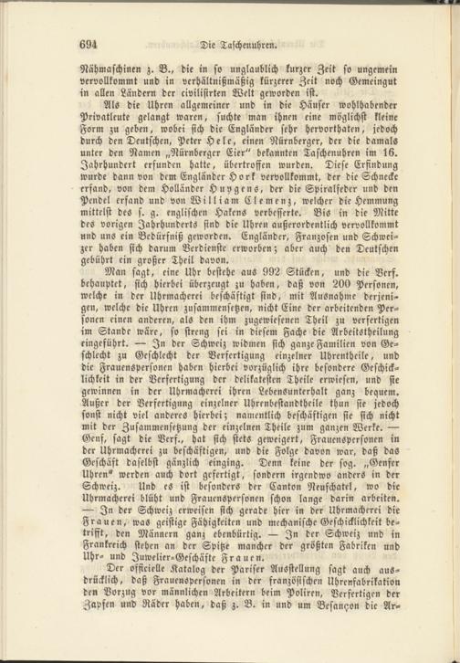 Man sagt, eine Uhr bestehe aus 992 Stücken, und die Vers. behauptet, sich hierbei überzeugt zu haben, daß von 200 Personen, welche in der Uhrmacherei beschäftigt sind, mit Ausnahme derjenigen, welche die Uhren zusammensetzen, nicht Eine der arbeitenden Personen einen anderen, als den ihm zugewiesenen Theil zu verfertigen im Stande wäre, so streng sei in diesem Fache die Arbeitstheilung eingeführt. — In der Schweiz widmen sich ganze Familien von Geschlecht zu Geschlecht der Verfertigung einzelner Uhrentheile, und die Frauenspersonen haben hierbei vorzüglich ihre besondere Geschick- lichkeit in der Verfertigung der delikatesten Theile erwiesen, und sie gewinnen in der Uhrmacherci ihren Lebensunterhalt ganz bequem. Außer der Verfertigung einzelner Uhrenbestandtheile thun sie jedoch sonst nicht viel anderes hierbei; namentlich beschäftigen sie sich nicht mit der Zusammensetzung der einzelnen Theile zum ganzen Werke. — Genf, sagt die Verf., hat sich stets geweigert, Frauenspersonen in der Uhrmacherei zu beschäftigen, und die Folge davon war, daß das Geschäft daselbst gänzlich einging. Denn keine der sog. „Genfer Uhren" werden auch dort gefertigt, sondern irgendwo anders in der Schweiz. Und es ist besonders der Canton Neufchatel, wo die Uhrmacherei blüht und Frauenspersonen schon lange darin arbeiten. — In der Schweiz erweisen sich gerade hier in der Uhrmacherei die Frauen, was geistige Fähigkeiten und mechanische Geschicklichkeit betrifft, den Männern ganz ebenbürtig. — In der Schweiz und in Frankreich stehen an der Spitze mancher der größten Fabriken und Uhr- und Juwelier-Geschäfte Frauen.