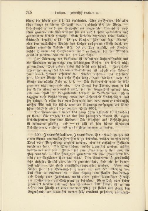 Zur Erlernung des Lackirens ist besonders Aufmerksamkeit und die Ausdauer nothwendig, von beständigem Stehen der Arbeit nicht zu ermüden. Das andere findet sich leicht und schnell. Zur gründlichen Erlernung des Ornamental-Lackirens ist jedoch eine Lehrzeit von 3 — 4 Jahren erforderlich. Knaben erhalten als Lehrlinge K 1. 50 Per Woche, das erste Jahr lang, dann 50 Cts. mehr die Woche das nächste Jahr u. s. f. — Die Lackirarbeit wird im Allgemeinen nicht ungesund sein. Der Geruch des Theers, wenn er bei der Lackbereitung angewendet wird, soll im Gegentheil gesund sein, und man schickt oft Lungenkranke deshalb in Lackkochereien. Wenn dagegen diese Beschäftiguug etwas der Gesundheit Nachteiliges mit sich bringt, so rührt das vom Terpentin her, der, wenn er verdampft, weißes Blei mit sich führt, was den Athmungswerkzeugen des Menschen schädlich wird (siehe dagegen Seite 665).
