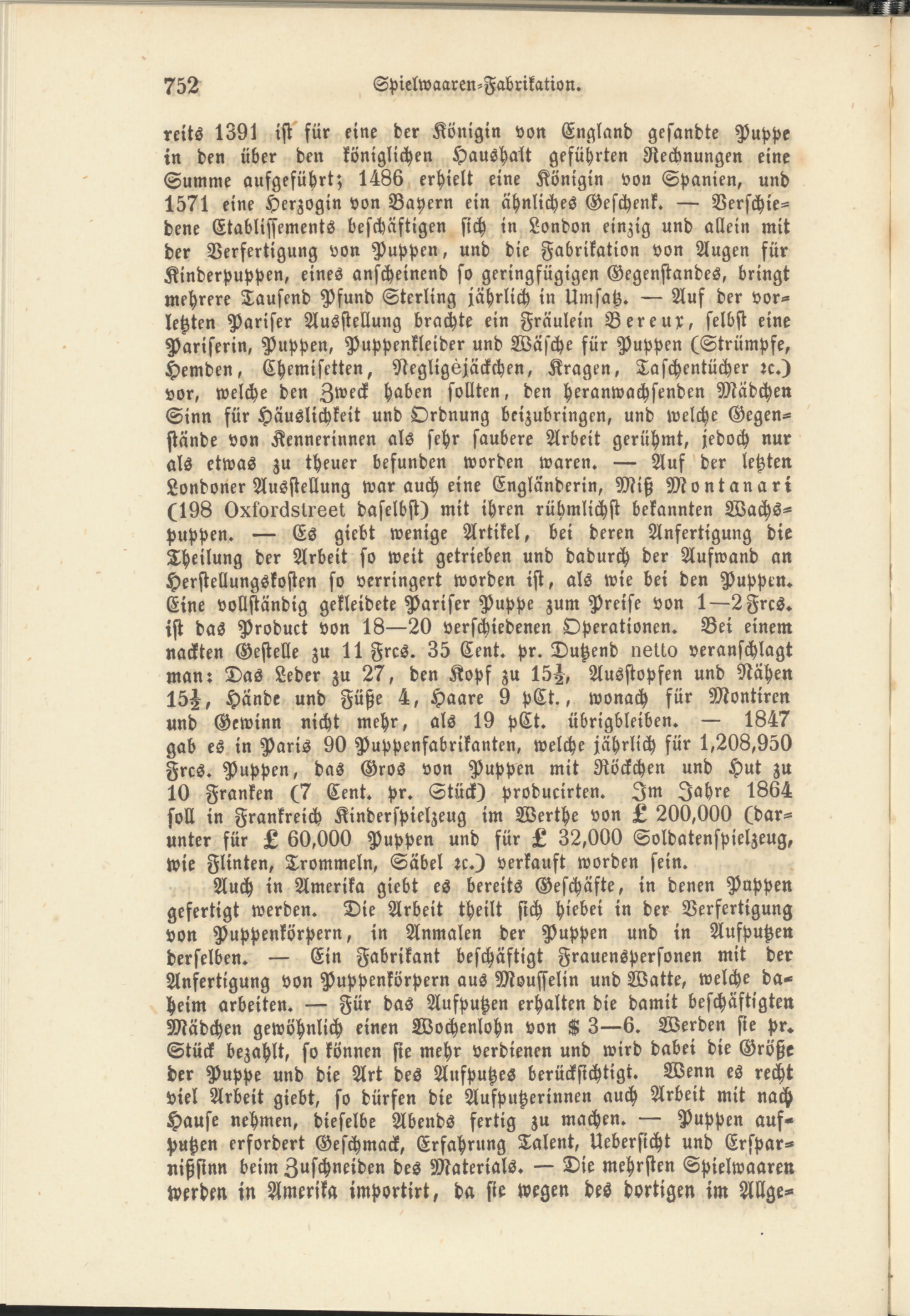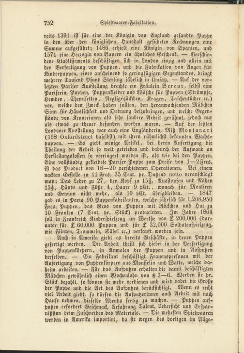 reits 1591 ist für eine der Königin von England gesandte Puppe in den über den königlichen Haushalt geführten Rechnungen eine Summe aufgeführt; 1486 erhielt eine Königin von Spanien, und 1571 eine Herzogin von Bayern ein ähnliches Geschenk. — Verschiedene Etablissements beschäftigen sich in London einzig und allein mit der Verfertigung von Puppen, und die Fabrikation von Augen für Kinderpuppen, eines anscheinend so geringfügigen Gegenstandes, bringt mehrere Tausend Pfund Sterling jährlich in Umsatz. — Auf der vorletzten Pariser Ausstellung brachte ein Fräulein Bereux, selbst eine Pariserin, Puppen, Puppenkleider und Wäsche für Puppen (Strümpfe, Hemden, Chemisetten, Negligejäckchen, Kragen, Taschentücher rc.) vor, welche den Zweck haben sollten, den heranwachsenden Mädchen Sinn für Häuslichkeit und Ordnung beizubringen, und welche Gegenstände von Kennerinnen als sehr saubere Arbeit gerühmt, jedoch nur als etwas zu theuer befunden worden waren. — Auf der letzten Londoner Ausstellung war auch eine Engländerin, Miß Montanari (198 Oxkorck8tr66t daselbst) mit ihren rühmlichst bekannten Wachspuppen. — Es giebt wenige Artikel, bei deren Anfertigung die Theilung der Arbeit so weit getrieben und dadurch der Aufwand an Herstellungskosten so verringert worden ist, als wie bei den Puppen. Eine vollständig gekleidete Pariser Puppe zum Preise von 1—2Frcs. ist das Produkt von 18—20 verschiedenen Operationen. Bei einem nackten Gestelle zu 11 Frcs. 35 Cent. pr. Dutzend netto veranschlagt man: Das Leder zu 27, den Kopf zu 15A, Ausstopfen und Nähen 15H, Hände und Füße 4, Haare 9 pCt., wonach für Montiren und Gewinn nicht mehr, als 19 pCt. übrigbleiben. — 1847 gab es in Paris 90 Puppenfabrikanten, welche jährlich für 1,208,950 Frcs. Puppen, das Gros von Puppen mit Röckchen und Hut zu 10 Franken (7 Cent. Pr. Stück) producirten. Im Jahre 1864 soll in Frankreich Kinderspielzeug im Werthe von A 200,000 (darunter für A 60,000 Puppen und für L 32,000 Soldatenspielzeug, wie Flinten, Trommeln, Säbel rc.) verkauft worden sein.