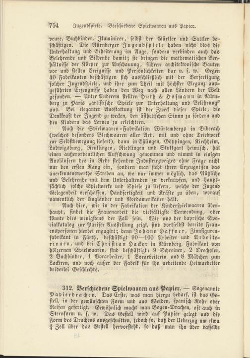 veure, Buchbinder, Iluminirer, selbst der Gürtler und Sattler beschäftigen. Die Nürnberger Jugend spiele haben nicht blos die Unterhaltung und Erheiterung im Auge, sondern verbinden auch das Belehrende und Bildende damit; sie bringen die mathematischen Verhältnisse der Körper zur Anschauung, führen architektonische Bauten vor und stellen Ereignisse und Persönlichkeiten dar u. s. w. Gegen 40 Fabrikanten beschäftigen sich ausschließlich mit der Verfertigung solcher Jugendspiele, und ihre zum Theil mit höchster Eleganz ausgeführten Erzeugnisse haben den Weg nach allen Ländern der Welt gefunden. — Unter Anderem stellten Huth L Hofmann in Nürnberg zu Paris „artistische Spiele zur Unterhaltung und Belehrung" aus. Bei eleganter Ausstattung ist der Zweck dieser Spiele, die Denkkraft der Jugend zu wecken, den ästhetischen Sinnn zu fördern und den Kindern das Lernen zu erleichtern.