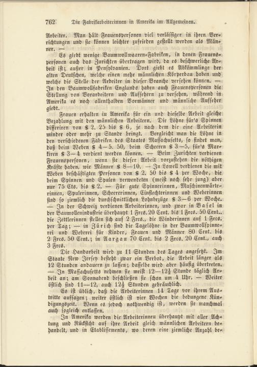 Es giebt wenige Baumwollwaaren-Fabriken, in denen Frauenspersonen auch das Zurichten übertragen wird, da es beschwerliche Arbeit ist; außer in Pensylvanien. Dort giebt es Abkömmlinge der alten Deutschen, welche einen mehr männlichen Körperbau haben und welche die Stelle der Arbeiter in dieser Branche versehen können. — In den Baumwollfabriken Englands haben auch Frauenspersonen die Stellung von Vorarbeitern und Aufsehern zu versehen, während in Amerika es noch allenthalben Vormänner und männliche Aufseher giebt.