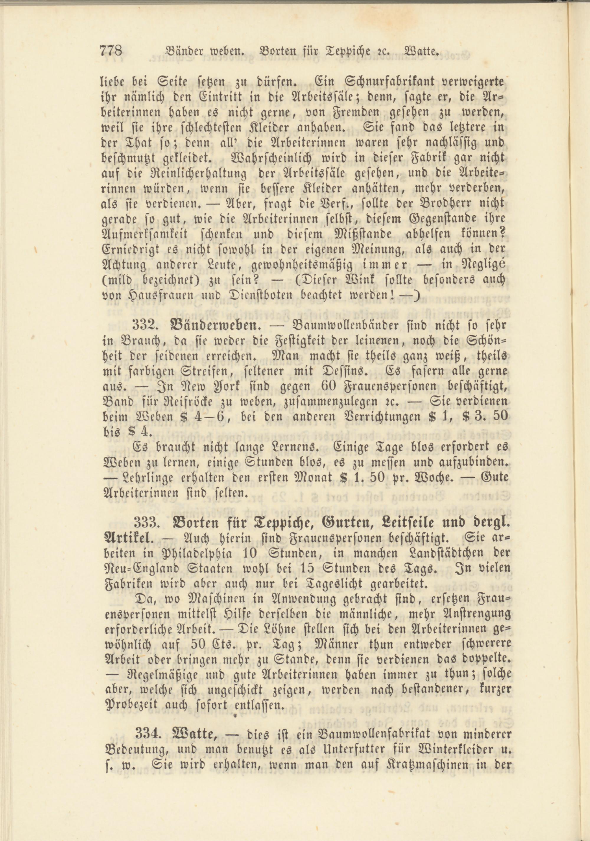 Da, wo Maschinen in Anwendung gebracht sind, ersetzen Frauenspersonen mittelst Hilfe derselben die männliche, mehr Anstrengung erforderliche Arbeit. — Die Löhne stellen sich bei den Arbeiterinnen gewöhnlich auf 50 Cts. pr. Tag; Männer thun entweder schwerere Arbeit oder bringen mehr zu Stande, denn sie verdienen das doppelte.