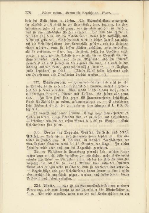 333. Borten für Teppiche, Gurten, Leitseile und dergl. Artikel. — Auch hierin sind Frauenspersonen beschäftigt. Sie arbeiten in Philadelphia 10 Stunden, in manchen Landstädtchen der Neu-England Staaten wohl bei 15 Stunden des Tags. In vielen Fabriken wird aber auch nur bei Tageslicht gearbeitet.