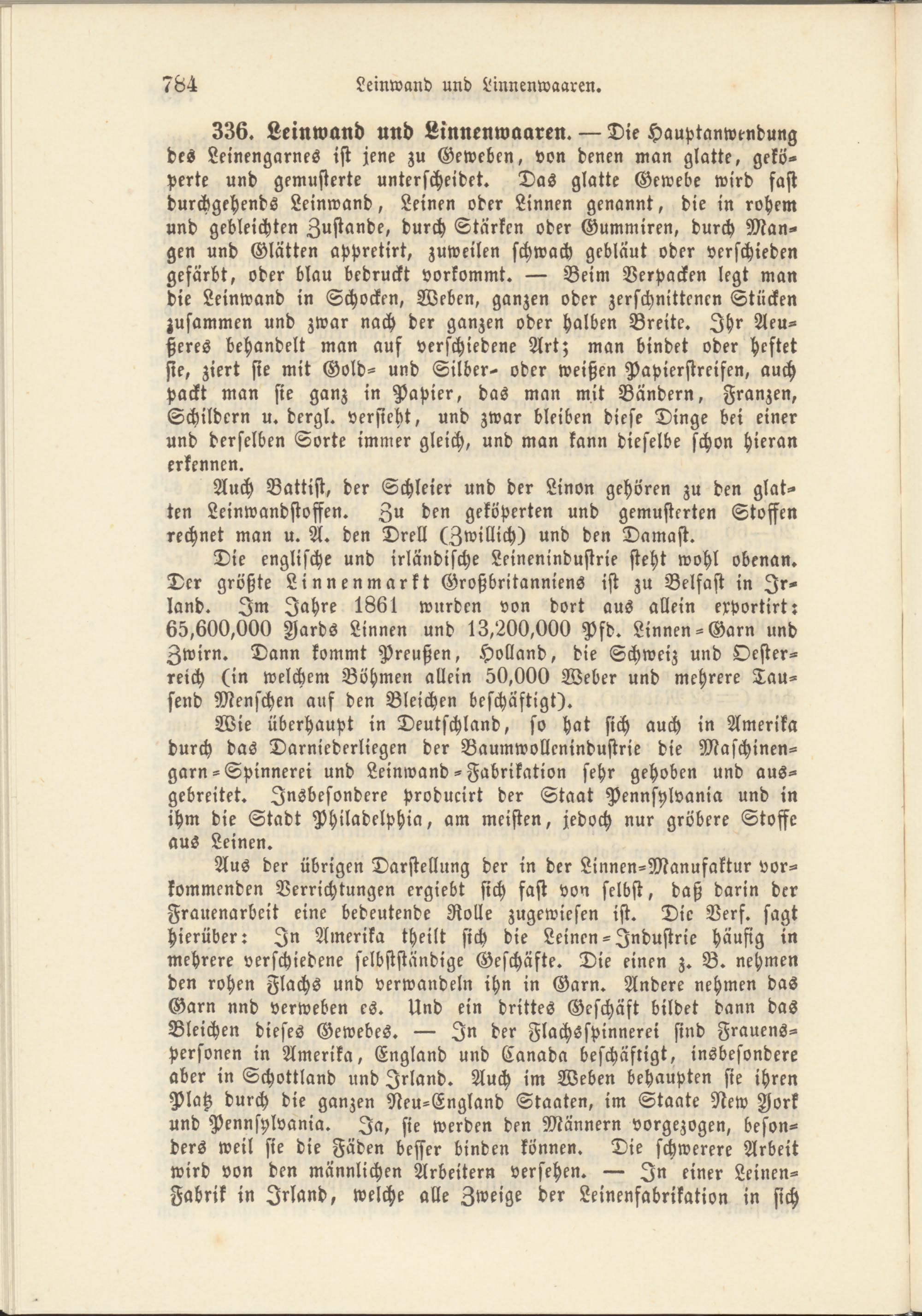 Die englische und irländische Leinenindustrie steht wohl obenan. Der größte Linnenmarkt Großbritanniens ist zu Belfast in Irland. Im Jahre 1861 wurden von dort aus allein exportirtr 65,600,000 Zjards Linnen und 13,200,000 Pfd. Linnen-Garn und Zwirn. Dann kommt Preußen, Holland, die Schweiz und Oesterreich (in welchem Böhmen allein 50,000 Weber und mehrere Tausend Menschen auf den Bleichen beschäftigt).
