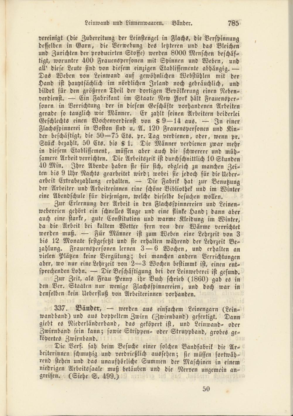 Die Verf. sah beim Besuche einer solchen Bandfabrik die Ar­beiterinnen schmutzig und verdrießlich aussehen; sie müssen fortwäh­rend stehen und das unaufhörliche Summen der Maschinen in einem niedrigen Arbeitssaale muß betäuben und die Nerven »«gemein an­greifen. (Siehe S. 499.)