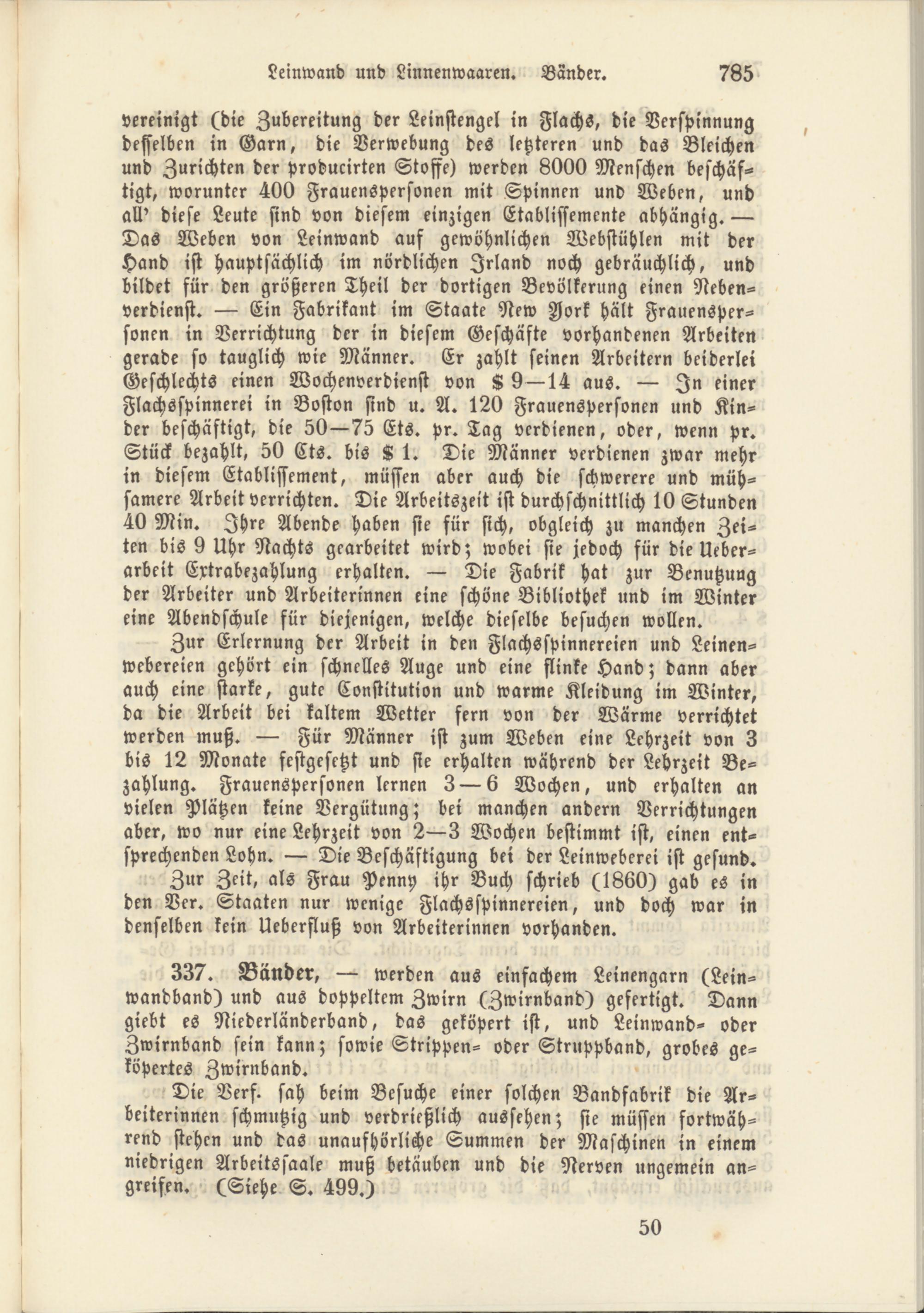 vereinigt (die Zubereitung der Leinstengel in Flachs, die Verspinnung desselben in Garn, die Verwebung des letzteren und das Bleichen und Zurichten der producirten Stoffe) werden 8000 Menschen beschäf­tigt, worunter 400 Frauenspersonen mit Spinnen und Weben, und all' diese Leute sind von diesem einzigen Etabliffemente abhängig. Das Weben von Leinwand auf gewöhnlichen Webstühlen mit der Hand ist hauptsächlich im nördlichen Irland noch gebräuchlich, und bildet für den größeren Theil der dortigen Bevölkerung einen Neben­verdienst. Ein Fabrikant im Staate New Zjork hält Frauensper­sonen in Verrichtung der in diesem Geschäfte vorhandenen Arbeiten gerade so tauglich wie Männer. Er zahlt seinen Arbeitern beiderlei Geschlechts einen Wochenverdienst von K 914 aus. In einer Flachsspinnerei in Boston sind u. A. 120 Frauenspersonen und Kin­der beschäftigt, die 5075 Ets. Pr. Tag verdienen, oder, wenn pr. Stück bezahlt, 50 Cts. bis S 1. Die Männer verdienen zwar mehr in diesem Etablissement, müssen aber auch die schwerere und müh­samere Arbeit verrichten. Die Arbeitszeit ist durchschnittlich 10 Stunden 40 Min. Ihre Abende haben sie für sich, obgleich zu manchen Zei­ten bis 9 Uhr Nachts gearbeitet wird; wobei sie jedoch für die Ueber- arbcit Extrabezahlung erhalten. Die Fabrik hat zur Benutzung der Arbeiter und Arbeiterinnen eine schöne Bibliothek und im Winter eine Abendschule für diejenigen, welche dieselbe besuchen wollen.