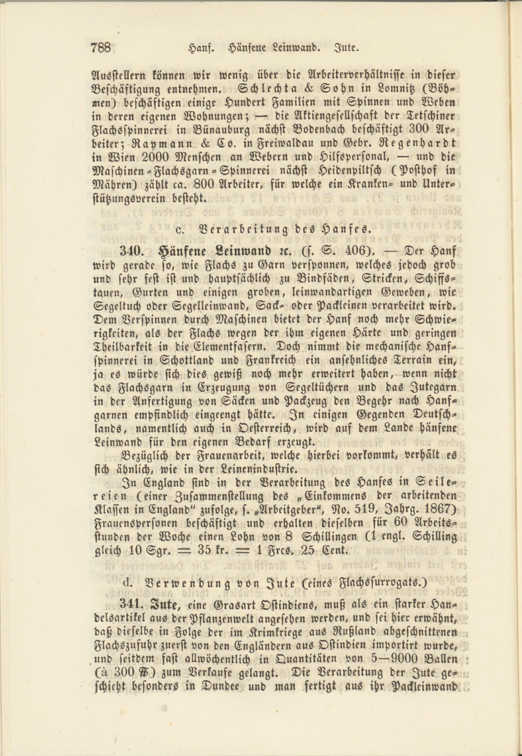 340. Hänfene Leinwand rc. (s. S. 406). — Der Hanf wird gerade so, wie Flachs zu Garn versponnen, welches jedoch grob und sehr fest ist und hauptsächlich zu Bindfäden, Stricken, Schiffs- tauen, Gurten und einigen groben, leinwandartigen Geweben, wie Segeltuch oder Segelleinwand, Sack- oder Packleinen verarbeitet wird. Dem Verspinnen durch Maschinen bietet der Hanf noch mehr Schwierigkeiten, als der Flachs wegen der ihm eigenen Härte und geringen Theilbarkeit in die Elementfasern. Doch nimmt die mechanische Hanfspinnerei in Schottland und Frankreich ein ansehnliches Terrain ein, ja es würde sich dies gewiß noch mehr erweitert haben, wenn nicht das Flachsgarn in Erzeugung von Segeltüchern und das Jutegarn in der Anfertigung von Säcken und Packzeug den Begehr nach Hanfgarnen empfindlich eingeengt hätte. In einigen Gegenden Deutschlands, namentlich auch in Oesterreich, wird auf dem Lande hänfene Leinwand für den eigenen Bedarf erzeugt.