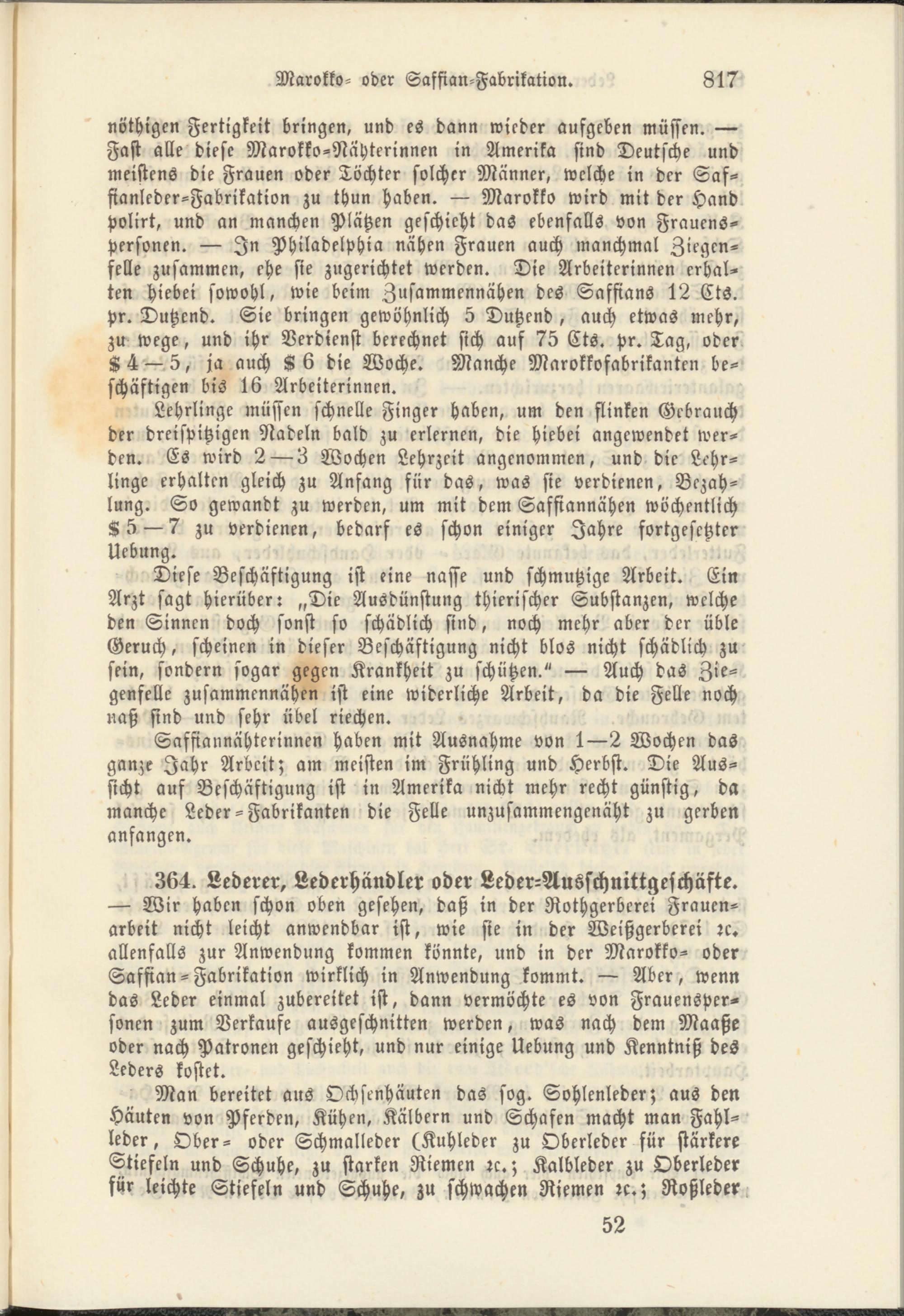 nöthigen Fertigkeit bringen, und es dann wieder aufgeben müssen. — Fast alle diese Marokko-Nähterinnen in Amerika sind Deutsche und meistens die Frauen oder Töchter solcher Männer, welche in der Saffianleder-Fabrikation zu thun haben. — Marokko wird mit der Hand polirt, und an manchen Plätzen geschieht das ebenfalls von Frauenspersonen. — In Philadelphia nähen Frauen auch manchmal Ziegen- felle zusammen, ehe sie zugerichtet werden. Die Arbeiterinnen erhalten Hiebei sowohl, wie beim Zusammennähen des Saffians 12 Cts. pr. Dutzend. Sie bringen gewöhnlich 5 Dutzend, auch etwas mehr, zu Wege, und ihr Verdienst berechnet sich auf 75 Cts. pr. Tag, oder K4 —5, ja auch K6 die Woche. Manche Marokkofabrikanten beschäftigen bis 16 Arbeiterinnen.