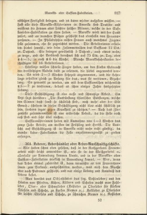 364. Lederer, Lederhändler oder Leder-Ausschnittgeschäfte. — Wir haben schon oben gesehen, daß in der Rothgerberei Frauenarbeit nicht leicht anwendbar ist, wie sie in der Weißgerberei rc. allenfalls zur Anwendung kommen könnte, und in der Marokko- oder Saffian-Fabrikation wirklich in Anwendung kommt. — Aber, wenn das Leder einmal zubereitet ist, dann vermöchte es von Frauenspersonen zum Verkaufe ausgeschnitten werden, was nach dem Maaße oder nach Patronen geschieht, und nur einige Uebung und Kenntniß des Leders kostet.