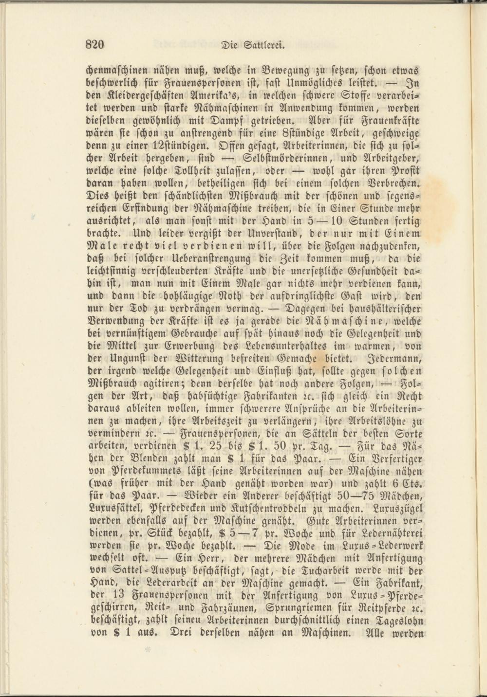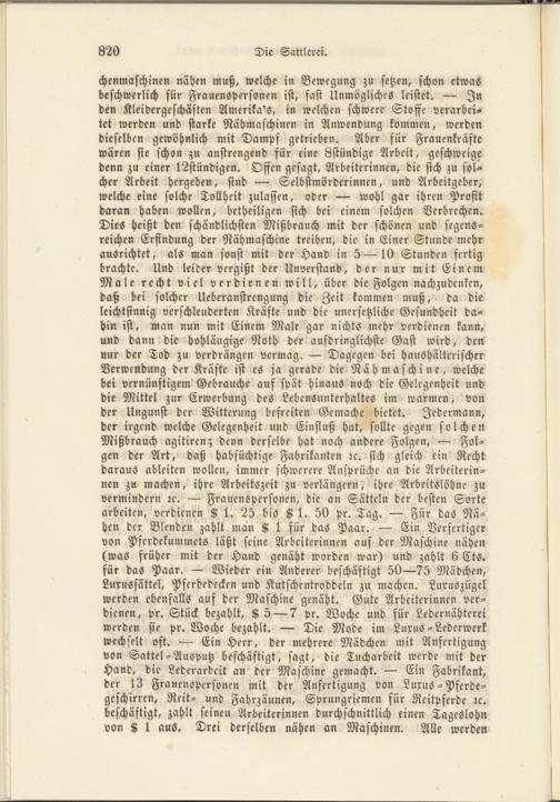 chenmaschinen nähen muß, welche in Bewegung zu sehen, schon etwas beschwerlich für Frauenspersonen ist, fast Unmögliches leistet. — In den Kleidergeschäften Amerika's, in welchen schwere Stoffe verarbeitet werden und starke Nähmaschinen in Anwendung kommen, werden dieselben gewöhnlich mit Dampf getrieben. Aber für Frauenkräfte wären sie schon zu anstrengend für eine 8stündige Arbeit, geschweige denn zu einer 12stündigen. Offen gesagt, Arbeiterinnen, die sich zu solcher Arbeit hergeben, sind — Selbstmörderinnen, und Arbeitgeber, welche eine solche Tollheit zulassen, oder — wohl gar ihren Profit daran haben wollen, betheiligen sich bei einem solchen Verbrechen. Dies heißt den schändlichsten Mißbrauch mit der schönen und segensreichen Erfindung der Nähmaschine treiben, die in Einer Stunde mehr ausrichtet, als man sonst mit der Hand in 5—10 Stunden fertig brachte. Und leider vergißt der Unverstand, der nur mit Einem Male recht viel verdienen will, über die Folgen nachzudenken, daß bei solcher Ueberanstrengung die Zeit kommen muß, da die leichtsinnig verschleuderten Kräfte und die unersetzliche Gesundheit dahin ist, man nun mit Einem Male gar nichts mehr verdienen kann, und dann die hohläugige Noth der aufdringlichste Gast wird, den nur der Tod zu verdrängen vermag. — Dagegen bei haushälterischer Verwendung der Kräfte ist es ja gerade die Nähmaschine, welche bei vernünftigem Gebrauche auf spät hinaus noch die Gelegenheit und die Mittel zur Erwerbung des Lebensunterhaltes im warmen, von der Ungunst der Witterung befreiten Gemache bietet. Jedermann, der irgend welche Gelegenheit und Einfluß hat, sollte gegen solchen Mißbrauch agitiren; denn derselbe hat noch andere Folgen, — Folgen der Art, daß habsüchtige Fabrikanten rc. sich gleich ein Recht daraus ableiten wollen, immer schwerere Ansprüche an die Arbeiterinnen zu machen, ihre Arbeitszeit zu verlängern, ihre Arbeitslöhne zu vermindern rc. — Frauenspersonen, die an Sätteln der besten Sorte arbeiten, verdienen K 1. 25 bis K 1. 50 pr. Tag. — Für das Nähen der Blenden zahlt man K 1 für das Paar. — Ein Verfertiger von Pferdekummets läßt seine Arbeiterinnen auf der Maschine nähen (was früher mit der Hand genäht worden war) und zahlt 6 Cts. für das Paar. — Wieder ein Anderer beschäftigt 50—75 Mädchen, Luxussättel, Pferdedecken und Kutschentroddeln zu machen. Luxuszügel werden ebenfalls auf der Maschine genäht. Gute Arbeiterinnen verdienen, pr. Stück bezahlt, K 5 — 7 pr. Woche und für Ledernähterei werden sie pr. Woche bezahlt. — Die Mode im Luxus-Lederwerk wechselt oft. -— Ein Herr, der mehrere Mädchen mit Anfertigung von Sattel-Ausputz beschäftigt, sagt, die Tucharbeit werde mit der Hand, die Lederarbcit an der Maschine gemacht. — Ein Fabrikant, der 13 Frauenspersonen mit der Anfertigung von Luxus-Pferdegeschirren, Reit- und Fahrzäunen, Sprungriemen für Reitpferde rc. beschäftigt, zahlt seineu Arbeiterinnen durchschnittlich einen Tageslohn von K 1 aus. Drei derselben nähen an Maschinen. Alle werden