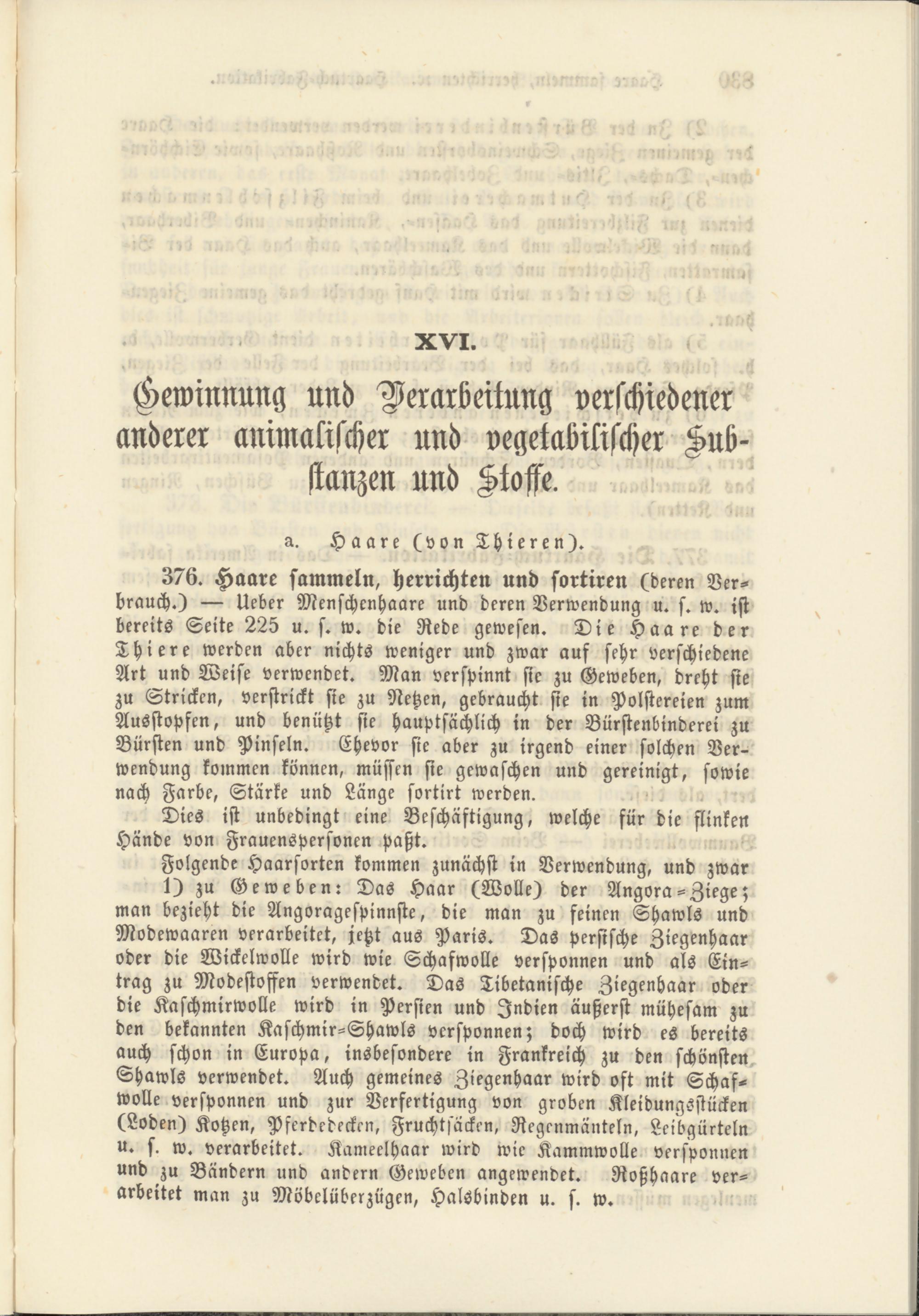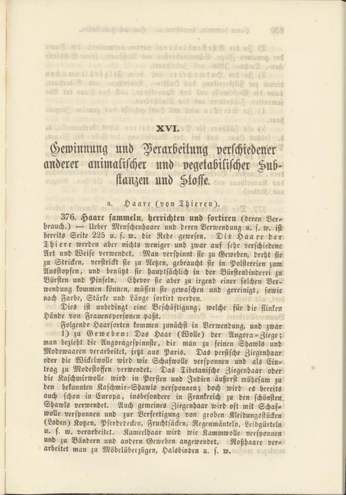 1) zu Geweben: Das Haar (Wolle) der Angora-Ziege; man bezieht die Angoragespinnste, die man zu feinen Shawls und Modewaaren verarbeitet, jetzt aus Paris. Das persische Ziegenhaar oder die Wickelwolle wird wie Schafwolle versponnen und als Eintrag zu Modestoffen verwendet. Das Tibetanische Ziegenhaar oder die Kaschmirwolle wird in Persien und Indien äußerst mühesam zu den bekannten Kaschmir-Shawls versponnen; doch wird es bereits auch schon in Europa, insbesondere in Frankreich zu den schönsten, Shawls verwendet. Auch gemeines Ziegenhaar wird oft mit Schafwolle versponnen und zur Verfertigung von groben Kleidungsstücken (Loden) Kotzen, Pferdedecken, Fruchtsäcken, Regenmanteln, Leibgürteln u. s. w. verarbeitet. Kameelhaar wird wie Kammwolle versponnen und zu Bändern und andern Geweben angewendet. Roßhaare verarbeitet man zu Möbelüberzügen, Halsbinden u. s. w.