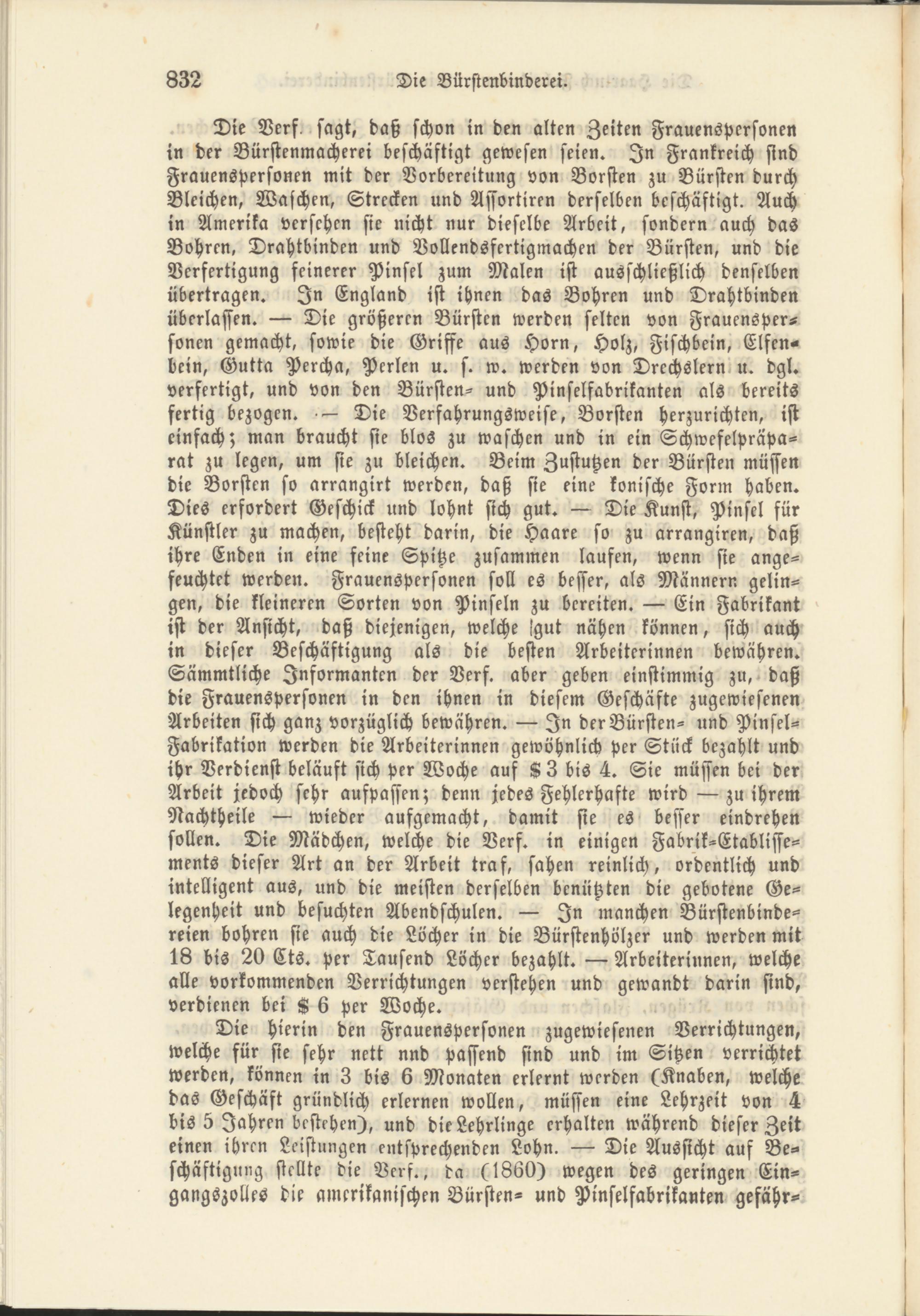 Die Verf, sagt, daß schon in den alten Zeiten Frauenspersonen in der Bürstenmacherei beschäftigt gewesen seien. In Frankreich sind Frauenspersonen mit der Vorbereitung von Borsten zu Bürsten durch Bleichen, Waschen, Strecken und Assortiren derselben beschäftigt. Auch in Amerika versehen sie nicht nur dieselbe Arbeit, sondern auch das Bohren, Drahtbinden und Vollendsfertigmachen der Bürsten, und die Verfertigung feinerer Pinsel zum Malen ist ausschließlich denselben übertragen. In England ist ihnen das Bohren und Drahtbinden überlassen. — Die größeren Bürsten werden selten von Frauenspersonen gemacht, sowie die Griffe aus Horn, Holz, Fischbein, Elfenbein, Gutta Percha, Perlen u. s. w. werden von Drechslern u. dgl. verfertigt, und von den Bürsten- und Pinselfabrikanten als bereits fertig bezogen. — Die Verfahrungsweise, Borsten herzurichten, ist einfach; man braucht sie blos zu waschen und in ein Schwefelpräparat zu legen, um sie zu bleichen. Beim Zustutzen der Bürsten müssen die Borsten so arrangirt werden, daß sie eine konische Form haben. Dies erfordert Geschick und lohnt sich gut. — Die Kunst, Pinsel für Künstler zu machen, besteht darin, die Haare so zu arrangiren, daß ihre Enden in eine feine Spitze zusammen laufen, wenn sie angefeuchtet werden. Frauenspersonen soll es besser, als Männern gelingen, die kleineren Sorten von Pinseln zu bereiten. — Ein Fabrikant ist der Ansicht, daß diejenigen, welche !gut nähen können, sich auch in dieser Beschäftigung als die besten Arbeiterinnen bewähren. Sämmtliche Informanten der Verf. aber geben einstimmig zu, daß die Frauenspersonen in den ihnen in diesem Geschäfte zugewiesenen Arbeiten sich ganz vorzüglich bewähren. — In der Bürsten- und Pinsel- Fabrikation werden die Arbeiterinnen gewöhnlich per Stück bezahlt und ihr Verdienst beläuft sich per Woche auf K 3 bis 4. Sie müssen bei der Arbeit jedoch sehr aufpassen; denn jedes Fehlerhafte wird —zu ihrem Nachtheile — wieder aufgemacht, damit sie es besser eindrehen sollen. Die Mädchen, welche die Verf. in einigen Fabrik-Etablissements dieser Art an der Arbeit traf, sahen reinlich, ordentlich und intelligent aus, und die meisten derselben benützten die gebotene Gelegenheit und besuchten Abendschulen. — In manchen Bürstenbinde- reien bohren sie auch die Löcher in die Bürstenhölzer und werden mit 18 bis 20 Cts. per Tausend Löcher bezahlt. — Arbeiterinnen, welche alle vorkommenden Verrichtungen verstehen und gewandt darin sind, verdienen bei K 6 per Woche.