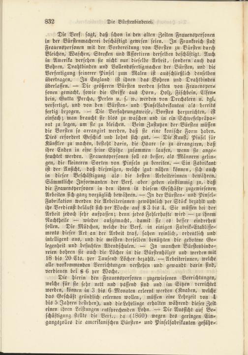 Die hierin den Frauenspersonen zugewiesenen Verrichtungen, welche für sie sehr nett nnd passend sind und im Sitzen verrichtet werden, können in 3 bis 6 Monaten erlernt werden (Knaben, welche das Geschäft gründlich erlernen wollen, müssen eine Lehrzeit von 4 bis 5 Jahren bestehen), und die Lehrlinge erhalten während dieser Zeit einen ihren Leistungen entsprechenden Lohn. — Die Aussicht auf Beschäftigung stellte die Verf., da (1860) wegen des geringen Ein- gangszolles die amerikanischen Bürsten- und Pinselfabrikanten gefähr-
