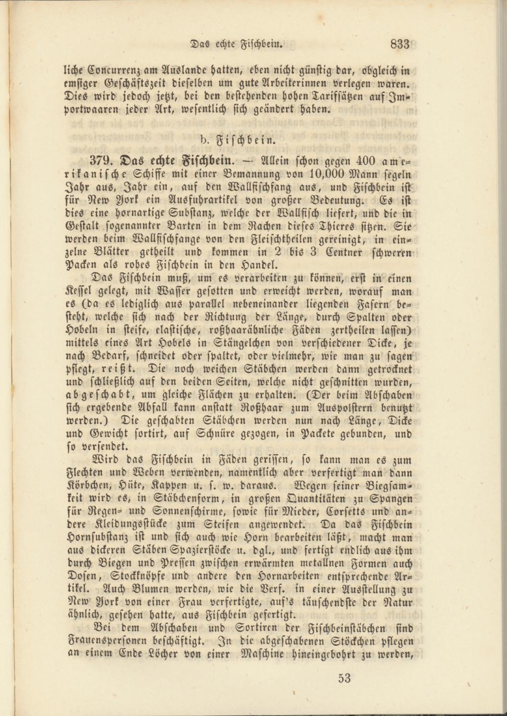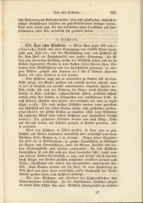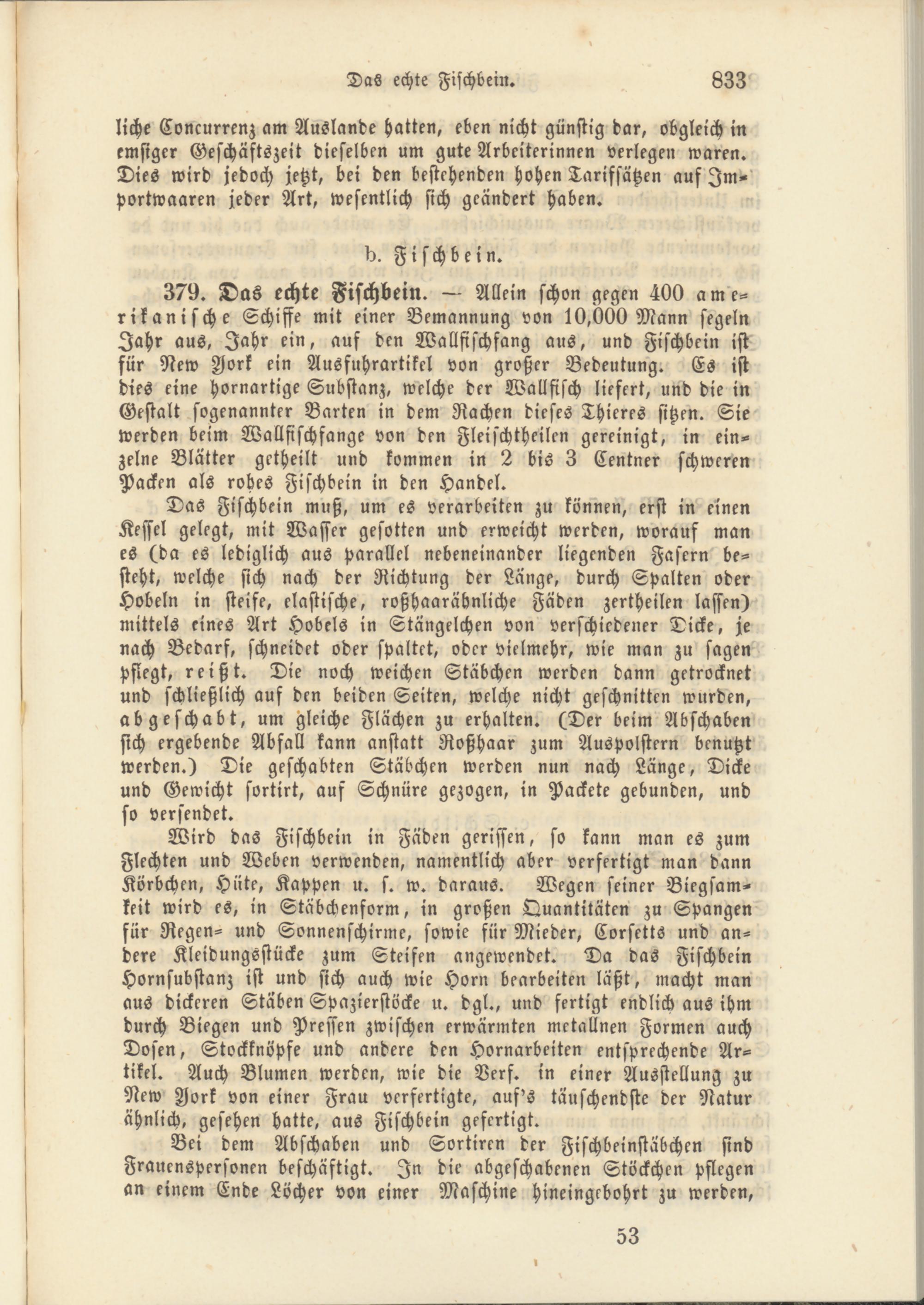 379. Das echte Fischbein. — Allein schon gegen 400 amerikanische Schiffe mit einer Bemannung von 10,000 Mann segeln Jahr aus, Jahr ein, auf den Wallfischfang aus, und Fischbein ist für New Aork ein Ausfuhrartikel von großer Bedeutung. Es ist dies eine hornartige Substanz, welche der Wallfisch liefert, und die in Gestalt sogenannter Barten in dem Rachen dieses Thieres sitzen. Sie werden beim Wallfischfange von den Fleischtheilcn gereinigt, in einzelne Blätter getheilt und kommen in 2 bis 3 Centner schweren Packen als rohes Fischbein in den Handel.