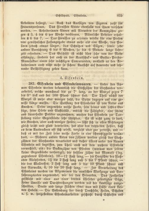 382. Elfenbein und Elfenbeinwaaren. — Unter den Namen Elfenbein werden bekanntlich die Stoßzähne der Elephanten verarbeitet, welche manchmal bis zu 7' lang, an der Wurzel gegen 7 bis 8" dick und bei 100 Pfund schwer sind. Der Theil nächst der Wurzel ist mehr oder weniger hohl, die Spitze dagegen auf eine gewisse Länge massiv. Die Substanz des Elfenbeins ist von Natur aus Knochen. Seine angenehme weiße Farbe, sein feines und lichtes Gefügt, seine Härte und Elasticität, endlich die Fähigkeit, eine schöne und dauerhafte Politur anzunehmen, machen das Elfenbein zur Darstellung vieler Gegenstände sehr schätzbar. Es ist nicht ganz so hart, wie Knochen, aber auch weniger spröde, — läßt sich in allen Richtungen gleich leicht und glatt bearbeiten, hat aber den doppelten Fehler, daß es beim Austrocknen oft sich wirft, verzieht oder gar zerreißt, und — daß es mit der Zeit seine weiße Farbe in eine schmutziggelbe verändert. — Mehrere andere Arten von Zähnen werden gleich den Stoßzähnen der Elephanten verarbeitet und daher öfters unter den Namen Elfenbein mit begriffen, zum Theil auch mit dem wahren Elfenbein verwechselt, als: die Backenzähne von Pferden (woraus man seltene kleine Gegenstände verfertigt), die fossilen Zähne des Mamuth (sog. gegrabenes Elfenbein), 10—12 Fuß lang, — die Hauzähne des Flußoder Nielpferdes, 14 bis 2 Fuß lang und 5 bis 7 Pfund schwer, — die des Wallrosses, 2 Fuß lang und 5 bis 10 Pfund schwer und des Narwalls, 6, 10 bis 20 Fuß lang. — Zur Verarbeitung des Elfenbeins werden im Allgemeinen die nemlichen Werkzeuge und Ver- fahrungsarten angewendet, wie bei den Beinarten. Das Zertheilen geschieht mit einer aus einer breiten Uhrfeder gefertigten Säge. Feine Umrisse und Durchbrechungen werden mit der Laubsäge ausgeschnitten. Breite und lange Flächen ebnet man mit Hülfe eines kleinen Hobels.— Die Vollendung der durch Drechseln, Feilen, Schaben u. s. w. hergestellten Elfenbeinarbeiten geschieht durch Schleifen und