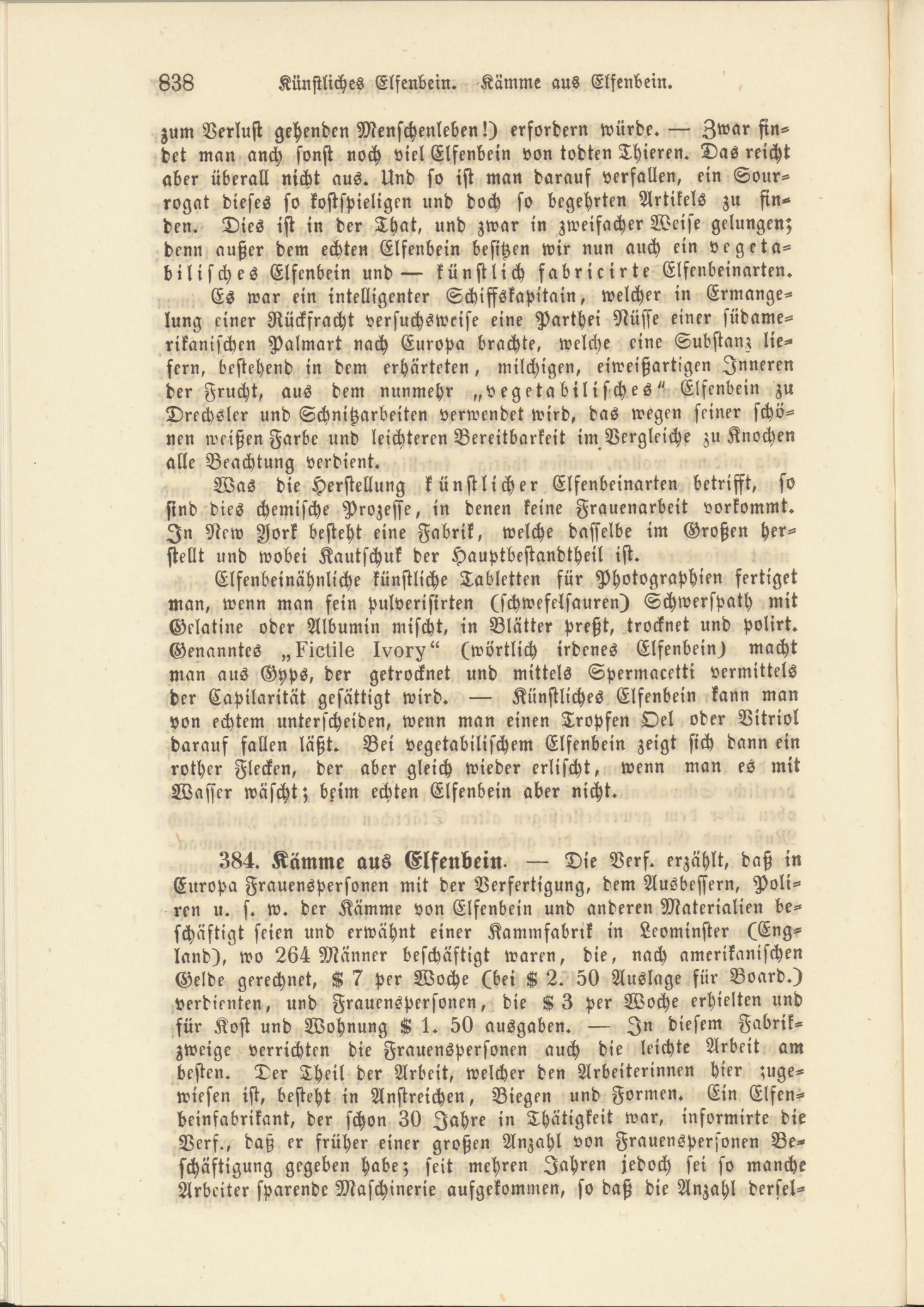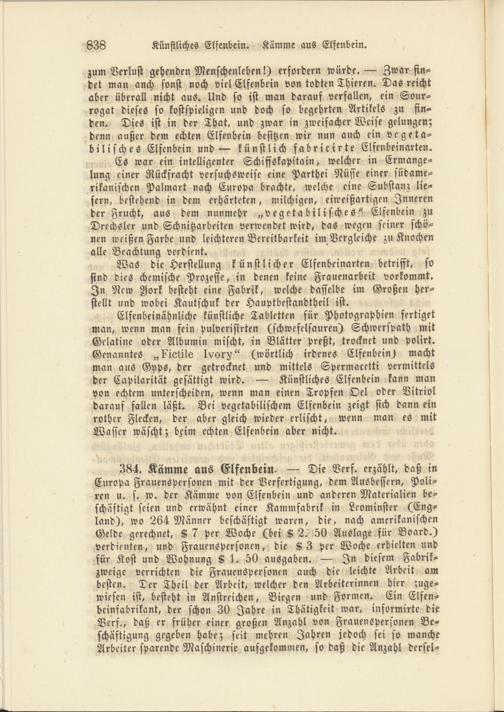 384. Kämme aus Elfenbein. — Die Vers. erzählt, daß in Europa Frauenspersonen mit der Verfertigung, dem Ausbessern, Poliren u. s. w. der Kämme von Elfenbein und anderen Materialien beschäftigt seien und erwähnt einer Kammfabrik in Leominster (England), wo 264 Männer beschäftigt waren, die, nach amerikanischen Gelde gerechnet, K 7 per Woche (bei K 2. 50 Auslage für Board.) verdienten, und Frauenspersonen, die A3 per Woche erhielten und für Kost und Wohnung K 1. 50 ausgaben. — In diesem Fabrikzweige verrichten die Frauenspersonen auch die leichte Arbeit am besten. Der Theil der Arbeit, welcher den Arbeiterinnen hier zugewiesen ist, besteht in Anstreichen, Biegen und Formen. Ein Elfenbeinfabrikant, der schon 30 Jahre in Thätigkeit war, informirte die Vers., daß er früher einer großen Anzahl von Frauenspersonen Beschäftigung gegeben habe; seit mehren Jahren jedoch sei so manche Arbeiter sparende Maschinerie aufgekommen, so daß die Anzahl dersel-
