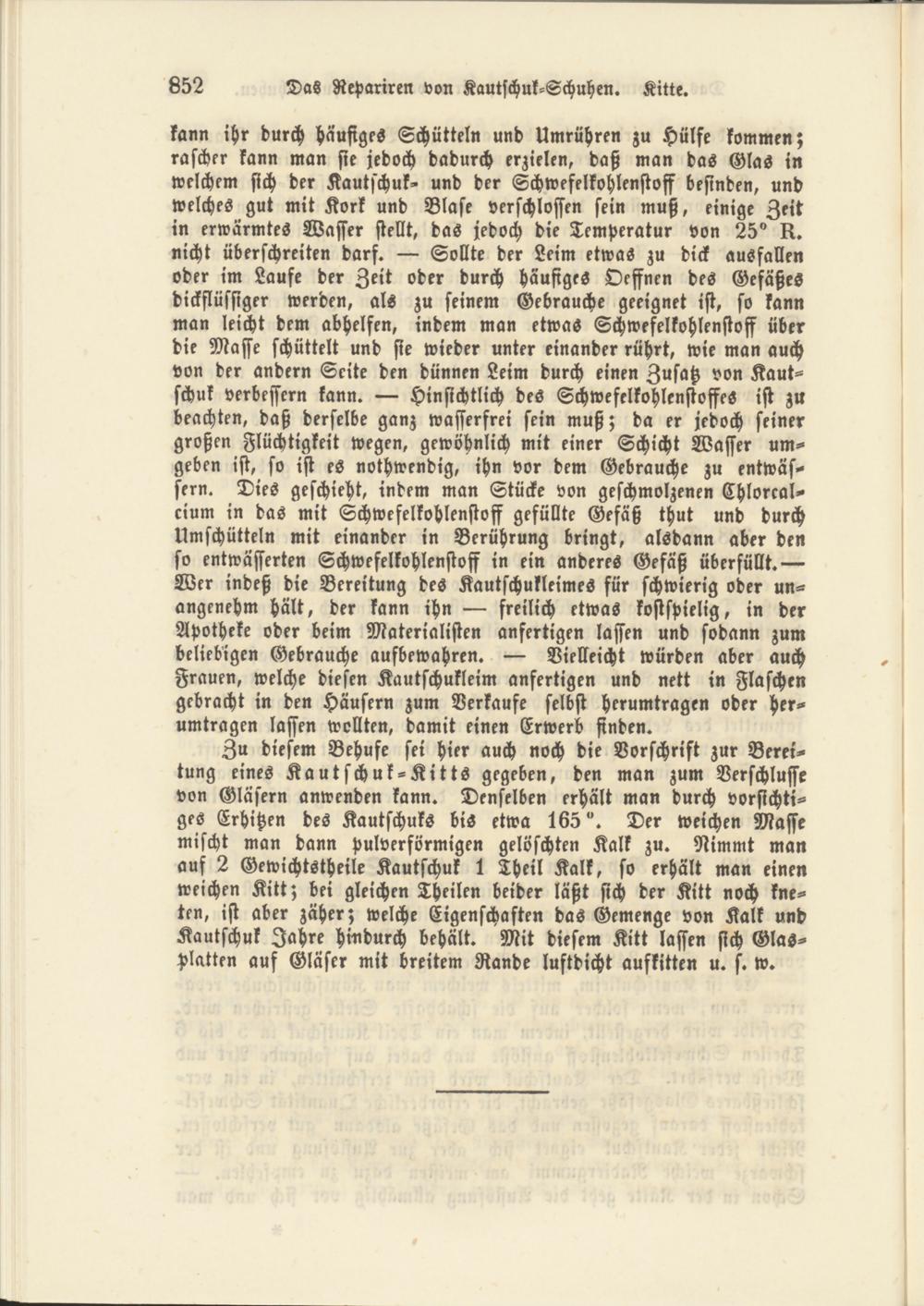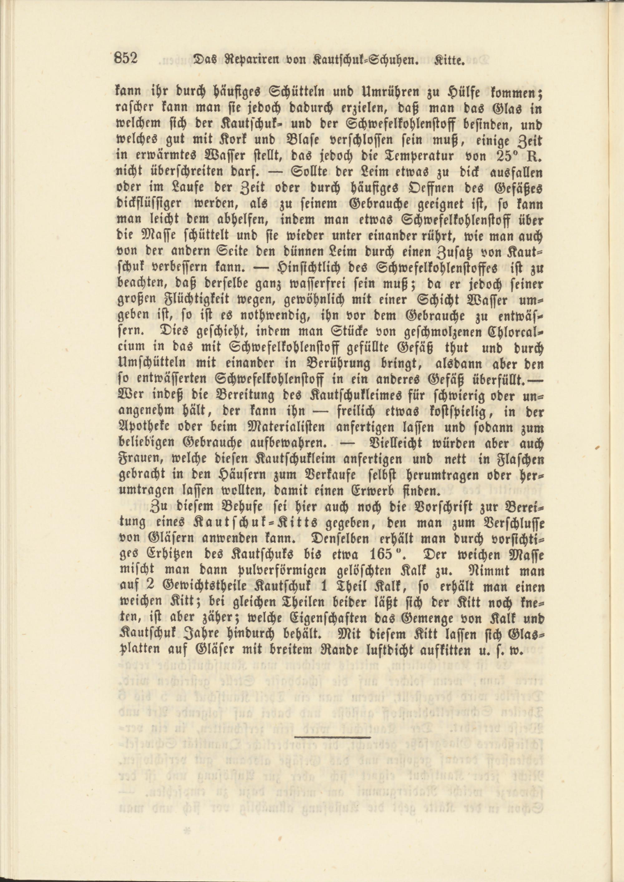 kann ihr durch häufiges Schütteln und Umrühren zu Hülfe kommen; rascher kann man sie jedoch dadurch erzielen, daß man das Glas in welchem sich der Kautschuk- und der Schwefelkohlenstoff befinden, und welches gut mit Kork und Blase verschlossen sein muß, einige Zeit in erwärmtes Wasser stellt, das jedoch die Temperatur von 25° k. nicht überschreiten darf. — Sollte der Leim etwas zu dick ausfallen oder im Laufe der Zeit oder durch häufiges Oeffnen des Gefäßes dickflüssiger werden, als zu seinem Gebrauche geeignet ist, so kann man leicht dem abhelfen, indem man etwas Schwefelkohlenstoff über die Masse schüttelt und sie wieder unter einander rührt, wie man auch von der andern Seite den dünnen Leim durch einen Zusatz von Kautschuk verbessern kann. — Hinsichtlich des Schwefelkohlenstoffes ist zu beachten, daß derselbe ganz wasserfrei sein muß; da er jedoch seiner großen Flüchtigkeit wegen, gewöhnlich mit einer Schicht Wasser umgeben ist, so ist es nothwendig, ihn vor dem Gebrauche zu entwässern. Dies geschieht, indem man Stücke von geschmolzenen Chlorcalcium in das mit Schwefelkohlenstoff gefüllte Gefäß thut und durch Umschütte!» mit einander in Berührung bringt, alsdann aber den so entwässerten Schwefelkohlenstoff in ein anderes Gefäß überfüllt.— Wer indeß die Bereitung des Kautschukleimes für schwierig oder unangenehm hält, der kann ihn — freilich etwas kostspielig, in der Apotheke oder beim Materialisten anfertigen lassen und sodann zum beliebigen Gebrauche aufbewahren. — Vielleicht würden aber auch Frauen, welche diesen Kautschukleim anfertigen und nett in Flaschen gebracht in den Häusern zum Verkaufe selbst herumtragen oder herumtragen lassen wollten, damit einen Erwerb finden.