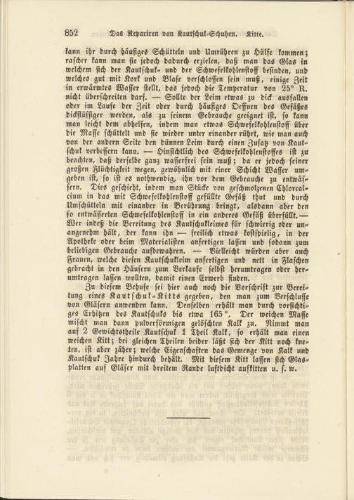 Zu diesem Behufe sei hier auch noch die Vorschrift zur Bereitung eines Kautschuk-Kitts gegeben, den man zum Verschlüsse von Gläsern anwenden kann. Denselben erhält man durch vorsichtiges Erhitzen des Kautschuks bis etwa 165°. Der weichen Masse mischt man dann pulverförmigen gelöschten Kalk zu. Nimmt man auf 2 Gewichtstheile Kautschuk 1 Theil Kalk, so erhält man einen weichen Kitt; bei gleichen Theilen beider läßt sich der Kitt noch kneten, ist aber zäher; welche Eigenschaften das Gemenge von Kalk und Kautschuk Jahre hindurch behält. Mit diesem Kitt lassen sich Glas- platten auf Gläser mit breitem Rande luftdicht auskitten u. s. w.