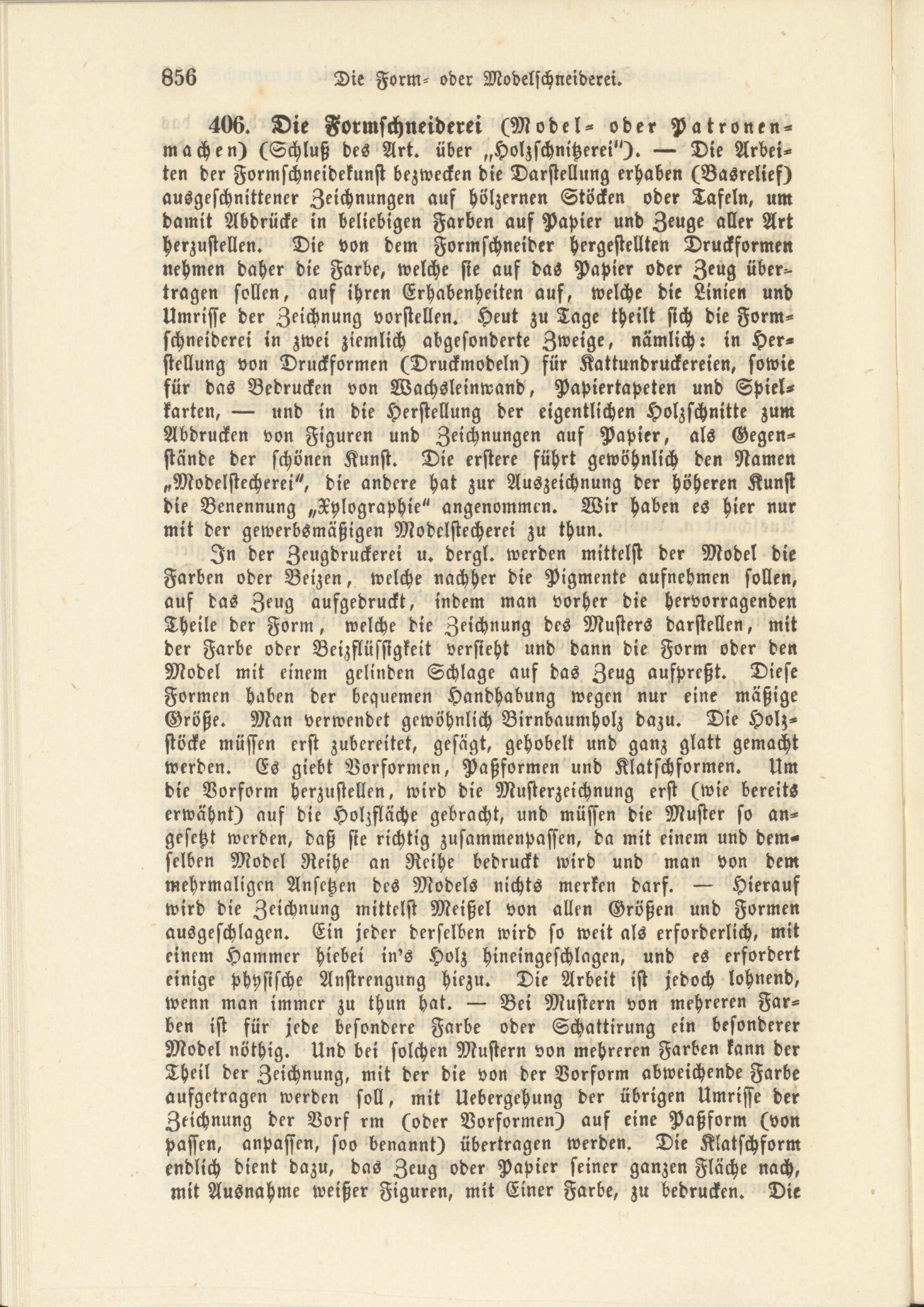 406. Die Formschneiderei (Model- oder Patronen- machen) (Schluß des Art. über „Holzschnitzerei"). — Die Arbeiten der Formschneidekunst bezwecken die Darstellung erhaben (Basrelief) ausgeschnittener Zeichnungen auf hölzernen Stöcken oder Tafeln, um damit Abdrücke in beliebigen Farben auf Papier und Zeuge aller Art herzustellen. Die von dem Formschneider hergestellten Druckformen nehmen daher die Farbe, welche sie auf das Papier oder Zeug übertragen sollen, auf ihren Erhabenheiten auf, welche die Linien und Umrisse der Zeichnung vorstellen. Heut zu Tage theilt sich die Formschneiderei in zwei ziemlich abgesonderte Zweige, nämlich: in Herstellung von Druckformen (Druckmodeln) für Kattundruckereien, sowie für das Bedrucken von Wachsleinwand, Papiertapeten und Spielkarten, — und in die Herstellung der eigentlichen Holzschnitte zum Abdrucken von Figuren und Zeichnungen auf Papier, als Gegenstände der schönen Kunst. Die erstere führt gewöhnlich den Namen „Modelstccherei", die andere hat zur Auszeichnung der höheren Kunst die Benennung „Xylographie" angenommen. Wir haben es hier nur mit der gewerbsmäßigen Modclstecherei zu thun.