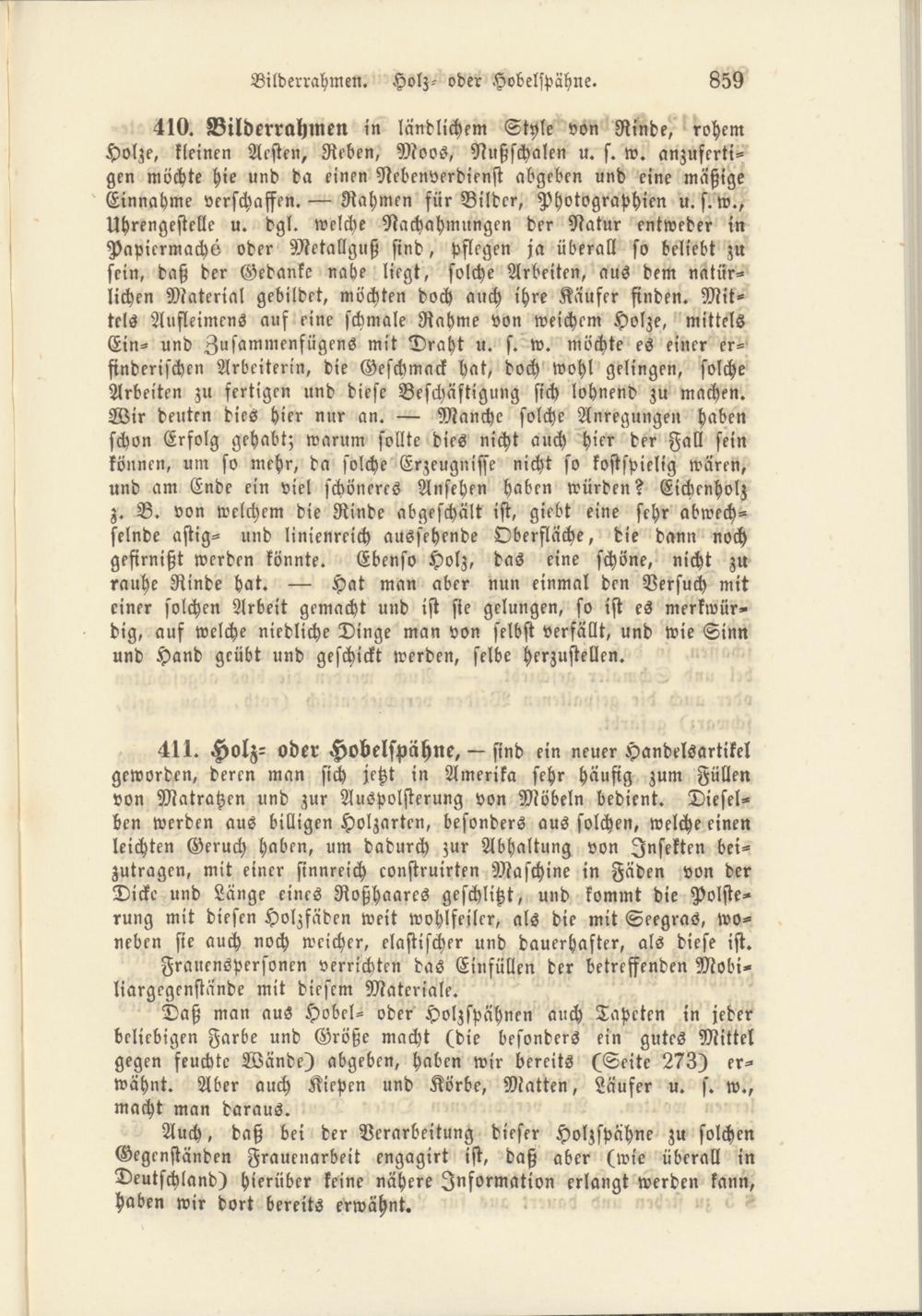 410. Bilderrahmen in ländlichem Style von Rinde, rohem Holze, kleinen Acsten, Reben, Moos, Nußschalen u. s. w. anzufertigen möchte hie und da einen Nebenverdienst abgeben und eine mäßige Einnahme verschaffen.— Rahmen für Bilder, Photographien u. s. w., Uhrengestelle u. dgl. welche Nachahmungen der Natur entweder in Papiermache oder Metallguß sind, pflegen ja überall so beliebt zu sein, daß der Gedanke nahe liegt, solche Arbeiten, aus dem natürlichen Material gebildet, möchten doch auch ihre Käufer finden. Mittels Aufleimens auf eine schmale Rahme von weichem Holze, mittels Ein- und Zusammenfügens mit Draht u. s. w. möchte es einer erfinderischen Arbeiterin, die Geschmack hat, doch wohl gelingen, solche Arbeiten zu fertigen und diese Beschäftigung sich lohnend zu machen. Wir deuten dies hier nur an. — Manche solche Anregungen haben schon Erfolg gehabt; warum sollte dies nicht auch hier der Fall sein können, um so mehr, da solche Erzeugnisse nicht so kostspielig wären, und am Ende ein viel schöneres Ansehen haben würden? Eichenholz z. B. von welchem die Rinde abgeschält ist, giebt eine sehr abwechselnde ästig- und linienreich aussehende Oberfläche, die dann noch gefirnißt werden könnte. Ebenso Holz, das eine schöne, nicht zu rauhe Rinde hat. — Hat man aber nun einmal den Versuch mit einer solchen Arbeit gemacht und ist sie gelungen, so ist es merkwürdig, auf welche niedliche Dinge man von selbst verfällt, und wie Sinn und Hand geübt und geschickt werden, selbe herzustellen.