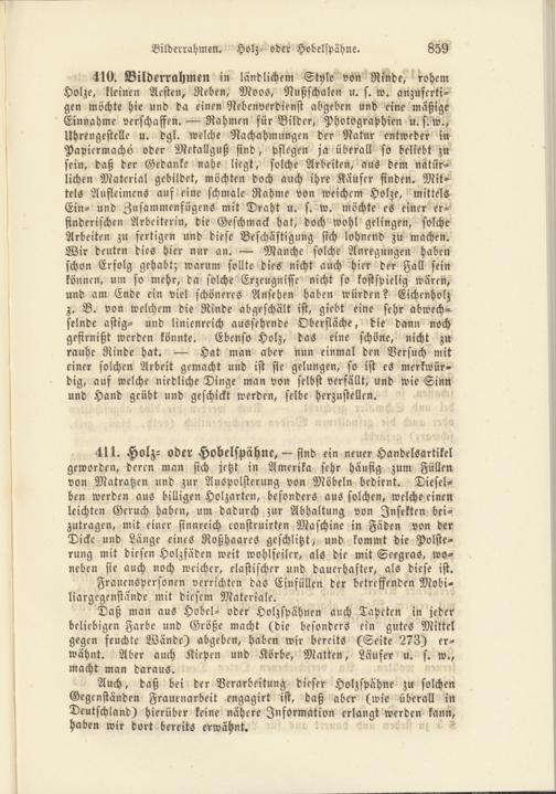 411. Holz- oder Hobelspähne, — sind ein neuer Handelsartikel geworden, deren man sich jetzt in Amerika sehr häufig zum Füllen von Matratzen und zur Auspolsterung von Möbeln bedient. Dieselben werden aus billigen Holzarten, besonders aus solchen, welche einen leichten Geruch haben, um dadurch zur Abhaltung von Insekten beizutragen, mit einer sinnreich construirten Maschine in Fäden von der Dicke und Länge eines Roßhaares geschlitzt, und kommt die Polsterung mit diesen Holzfäden weit wohlfeiler, als die mit Seegras, wo- neben sie auch noch weicher, elastischer und dauerhafter, als diese ist.