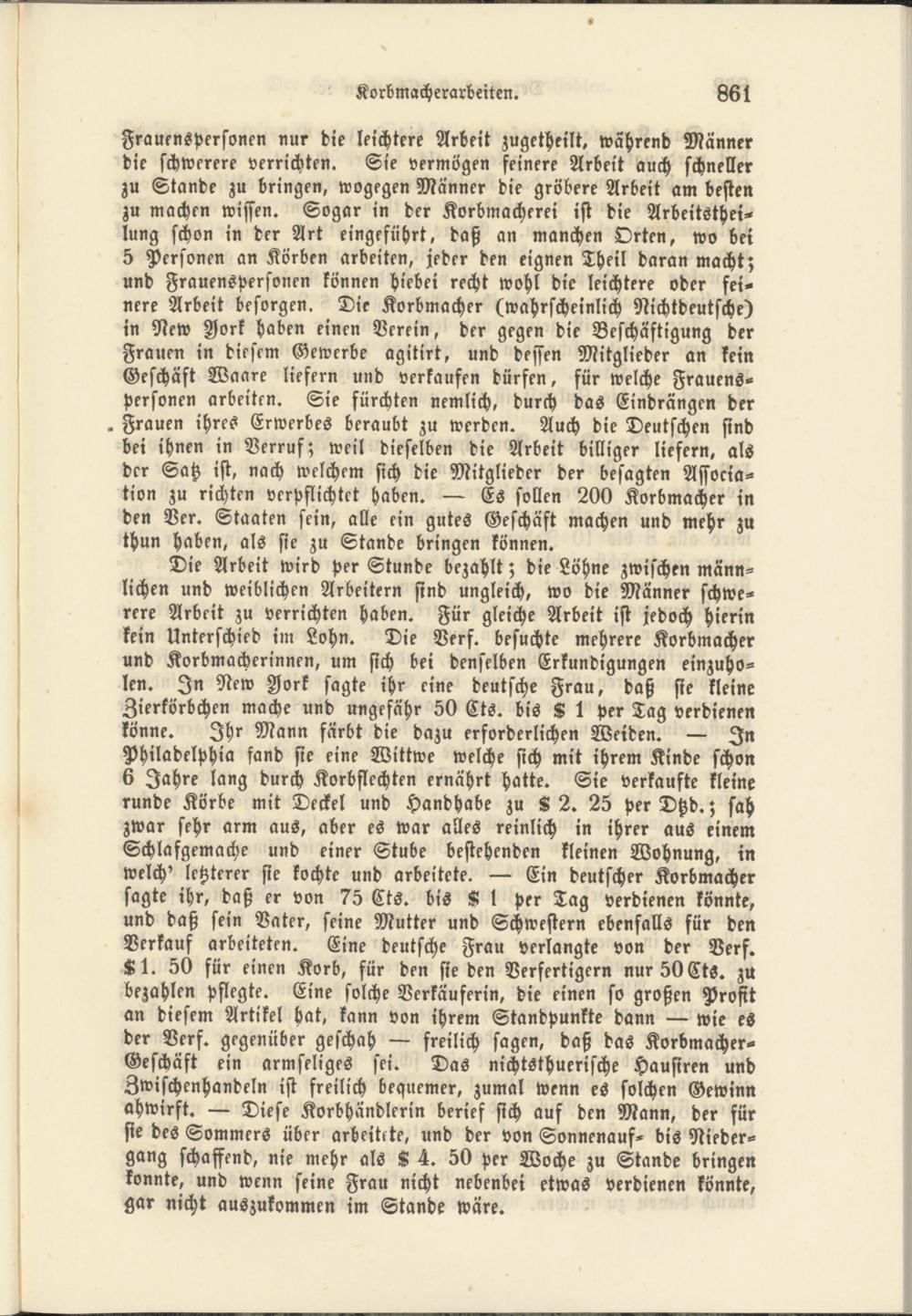 5 Personen an Körben arbeiten, jeder den eignen Theil daran macht; und Frauenspersonen können hiebei recht wohl die leichtere oder feinere Arbeit besorgen. Die Korbmacher (wahrscheinlich Nichtdeutsche) in New Aork haben einen Verein, der gegen die Beschäftigung der Frauen in diesem Gewerbe agitirt, und dessen Mitglieder an kein Geschäft Waare liefern und verkaufen dürfen, für welche Frauenspersonen arbeiten. Sie fürchten nemlich, durch das Eindrängen der